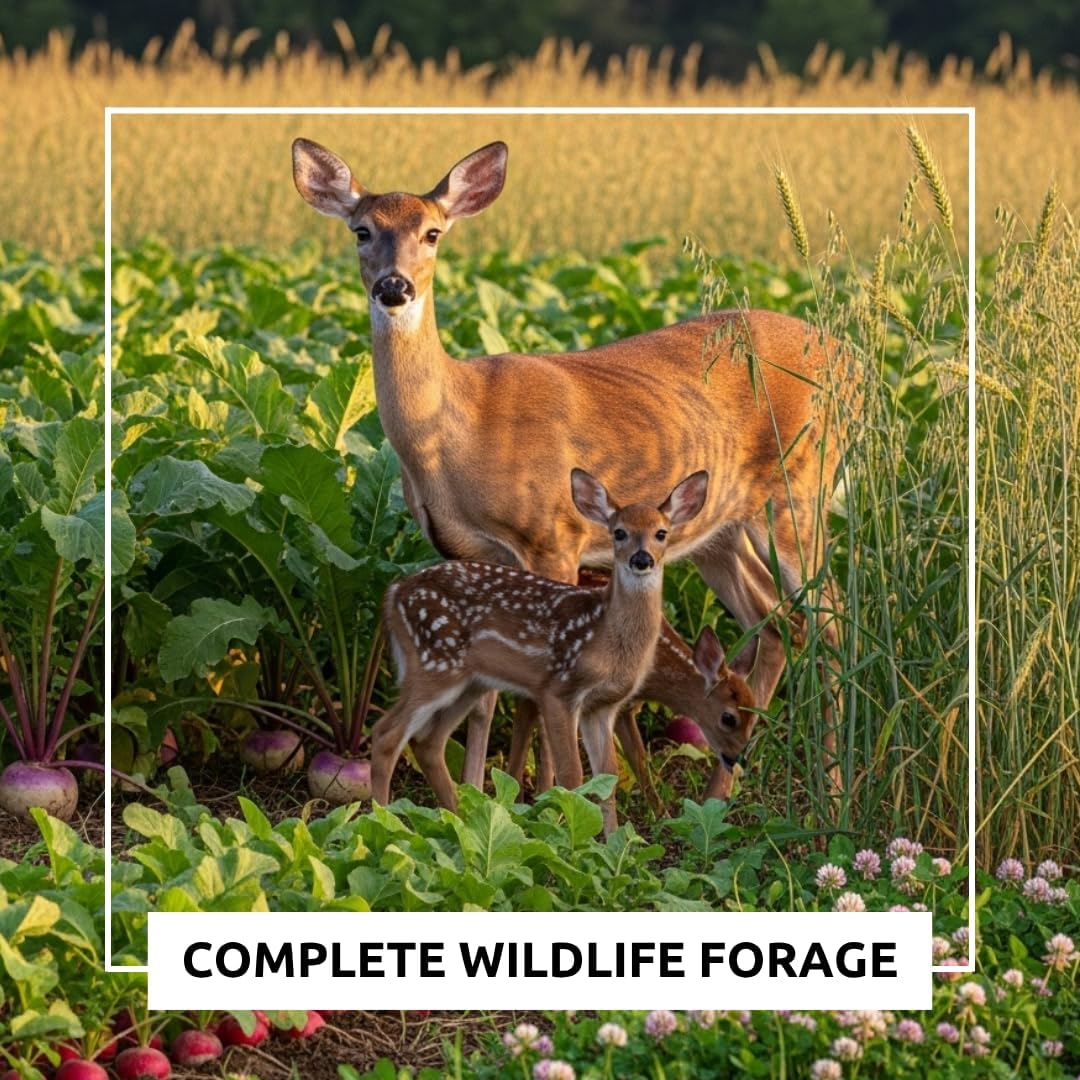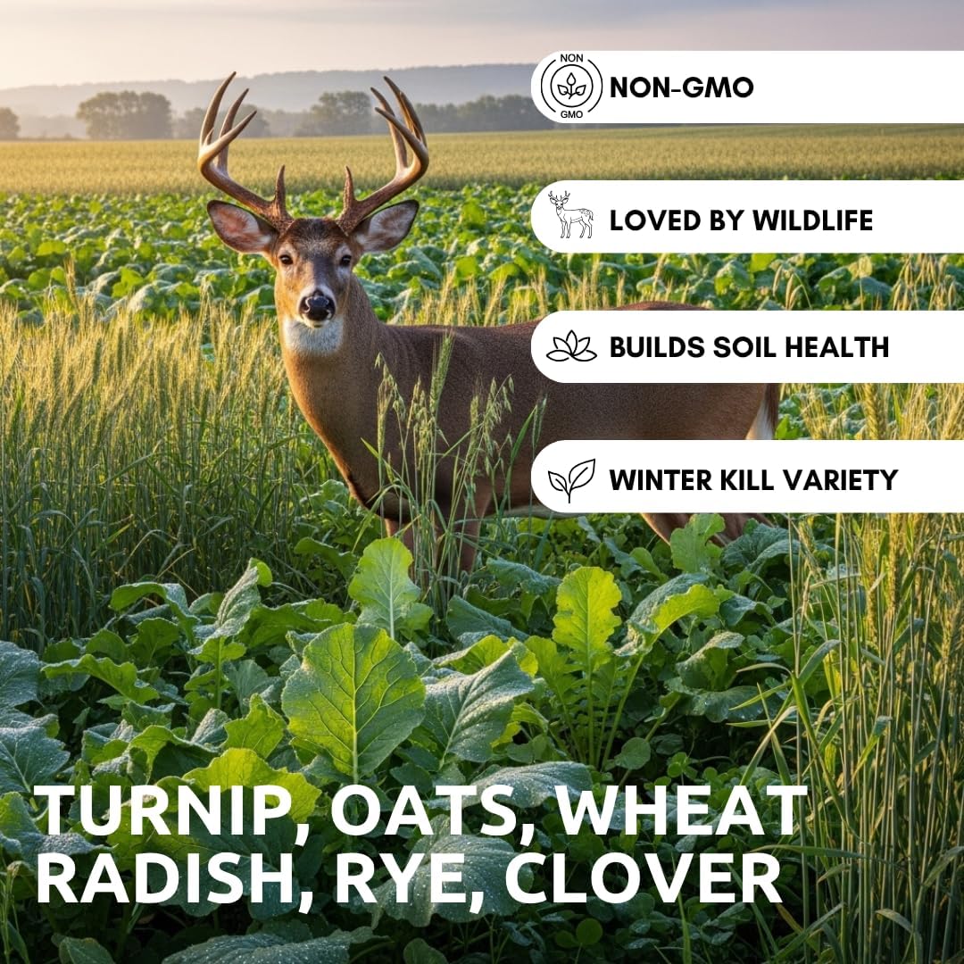 Buffalo Blend food plot seed builds soil and provides an excellent habitat for your wildlife. This mix contains seed species that work in unison to provide great ground cover and lush green forage. All plants are cold tolerant and will feed your critters during fall, winter and into early spring. The Buffalo Blend Whitetail Deer Food Plot Seed Mix is a premium, all-season blend specially formulated to attract and nourish deer, turkey, and other wildlife. Featuring a balanced combination of Turnip, Radish, Clover, Wheat, Rye, and Oats, this diverse seed mix provides both quick growth and long-lasting nutrition throughout the fall and winter months. This mix offers high protein and energy to support healthy antler development, body condition, and herd sustainability. Designed to thrive in a variety of soils and climates, the Buffalo Blend establishes quickly, resists grazing pressure, and keeps deer returning all season long. Perfect for hunters, land managers, and wildlife enthusiasts looking to create a lush, irresistible feeding area.