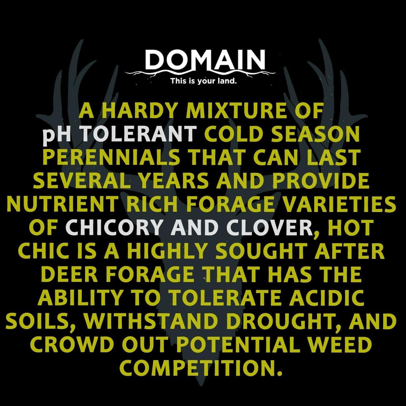 A hardy mixture of pH tolerant cold season perennials that can last several years and provide nutrient rich forage for your deer and turkey. With a variety of Chicory and two varieties of Clover, Hot Chic is a highly sought after deer forage that has the ability to tolerate acidic soils, withstand drought and crowd out potential weed competition. Hot Chic is perfect for helping to establish a brand new food plot location and is best maintained by fertilizing and periodic mowing. Hot Chic sets itself apart because of its adaptability – it can handle the heat of the South and the cold of the North, while also handling adverse soil environments and shady areas. Hot Chic not only can establish itself in shaded logging roads, trails and no-till back woods food plots, but also provides high levels of protein and forage making it highly attractive for your deer and extremely easy to work with. Hot Chic is a must have for every hunting property!