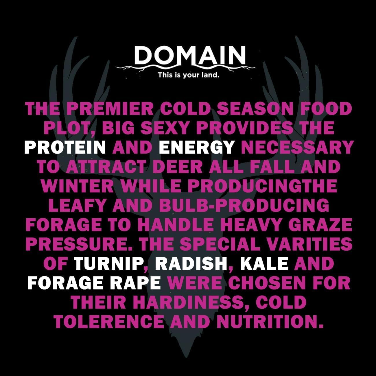 The Premier Fall and Winter Food Source, Big Sexy provides the protein and energy necessary to attract deer all Fall and Winter while providing leafy and bulb-producing forage to handle heavy graze pressure. The special varieties of turnip, rapeseed, kale and radish were chosen for their attractiveness, hardiness, cold tolerance and high levels of nutrition. As a result of differing stages of maturity of the plants, as well as the high level of protein in the leafy forage, you can expect deer to be attracted to your Big Sexy Plot from 2 weeks after germination until it’s gone…Big Sexy should be a deer magnet from the First day of hunting season until the last.