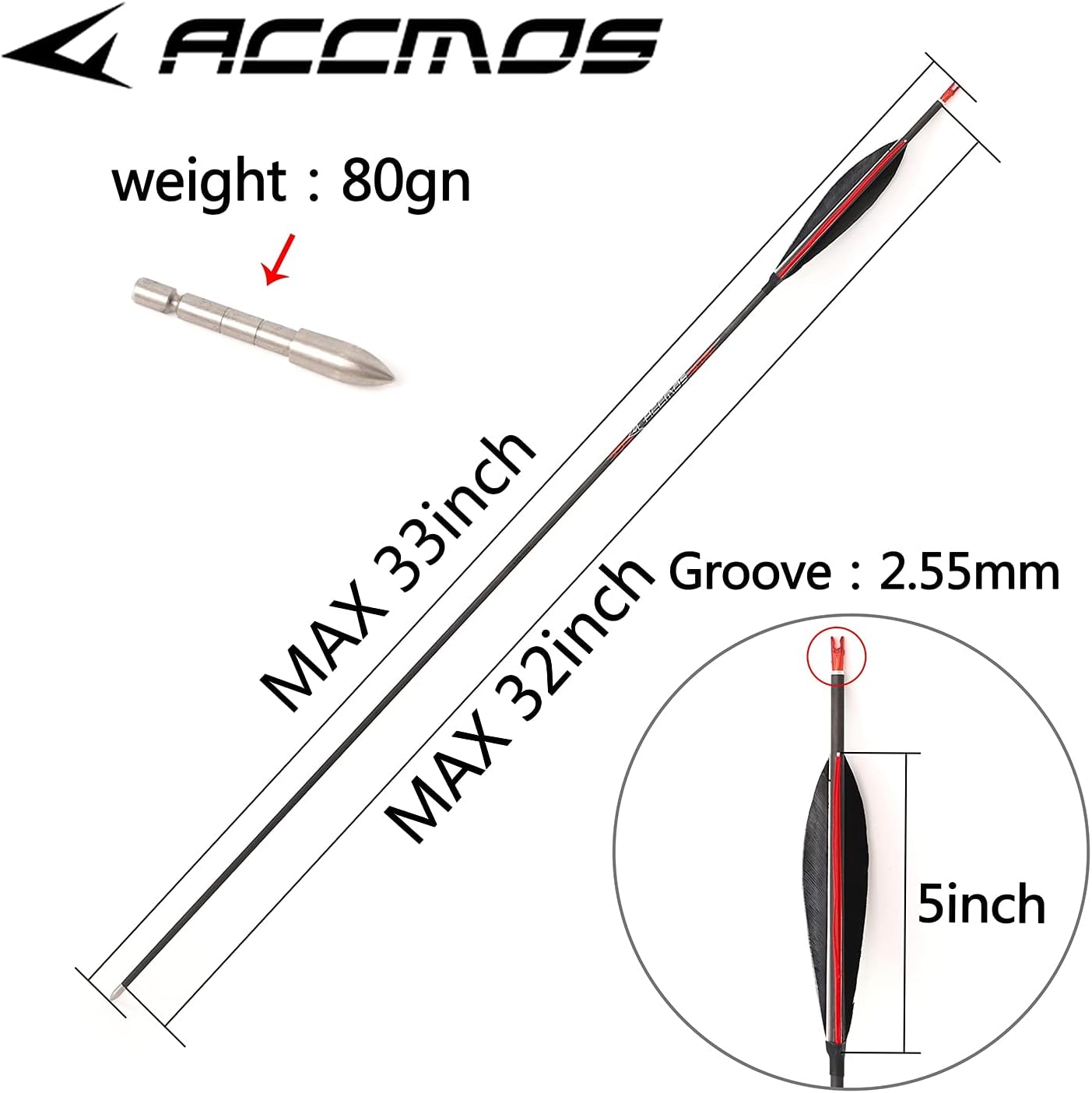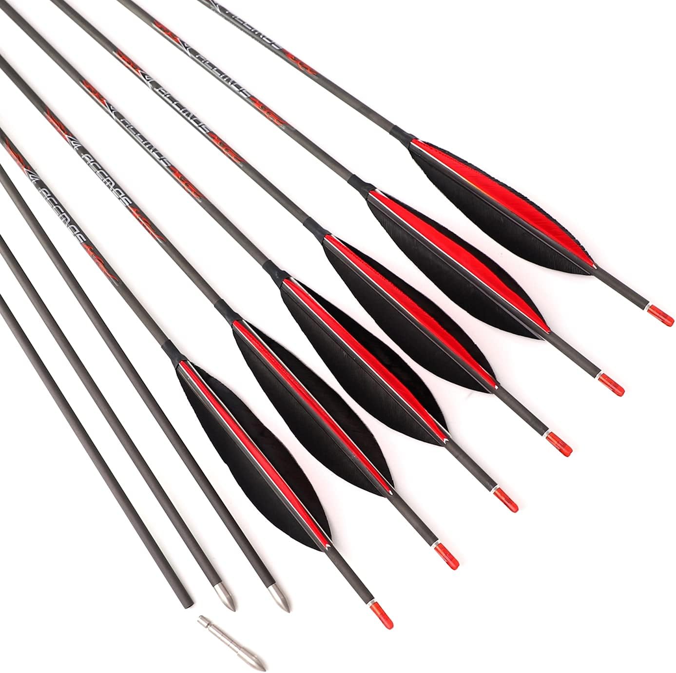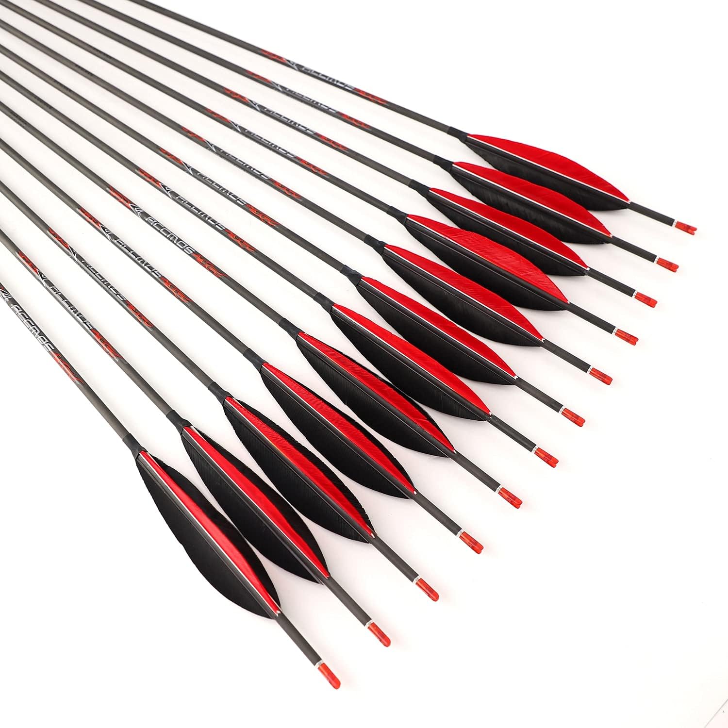 Inner Diameter 4.2mm (.165") Pure Carbon Arrow for Indoor Outdoor Target Practice and Hunting Technical Specification Material: 100% pure carbon fiber tube Straightness: +/-0.003" Spine: 300 350 400 500 600 700 800 900 1000 1100 1300 1500 1800 Max Shaft Length: Spine 300 = 31inches Spine 350 400 500 600 700 800 900 1000 1100 1300 1500 1800 = 32inches Outer Diameter: Spine 300 OD=6.46mm GPI=11.54grain/inch Spine 350 OD=6.21mm GPI=10.13grain/inch Spine 400 OD=6.12mm GPI=9.47grain/inch Spine 500 OD=5.82mm GPI=8grain/inch Spine 600 OD=5.72mm GPI=7.09grain/inch Spine 700 OD=5.55mm GPI=6.17grain/inch Spine 800 OD=5.41mm GPI=5.8grain/inch Spine 900 OD=5.36mm GPI=5.34grain/inch Spine 1000 OD=5.35mm GPI=4.9grain/inch Spine 1100 OD=5.22mm GPI=4.64grain/inch Spine 1300 OD=5.18mm GPI=4.16grain/inch Spine 1500 OD=5.05mm GPI=4grain/inch Spine 1800 OD=5mm GPI=3.89grain/inch Arrowhead: bullet point Fletching: 5" streamline turkey feathers, 2 black 1 red Nock: plastic nocks with aluminum pin Color: black shaft with black vanes Package: 12pcs carbon arrows"PPP" Features Precision: the strict production process makes these arrows up to the standard of competition arrows, making your archery more accurate and easy. Protective: the reasonable arrow weight can also reduce the energy transfer to the bow while ensuring the maximum initial speed. Purposeful: the combination of accessories makes them perfect for indoor outdoor training and shooting.Personal Customization If you didn't find the option you want, please choose CUSTOM SPINE & SIZE. Leave us message with the length and spine of arrow you need, we will customize the arrow for you.Note All items are NOT toys, please keep away from kids.