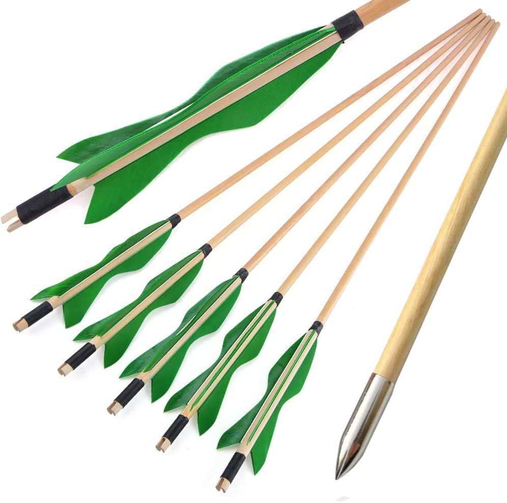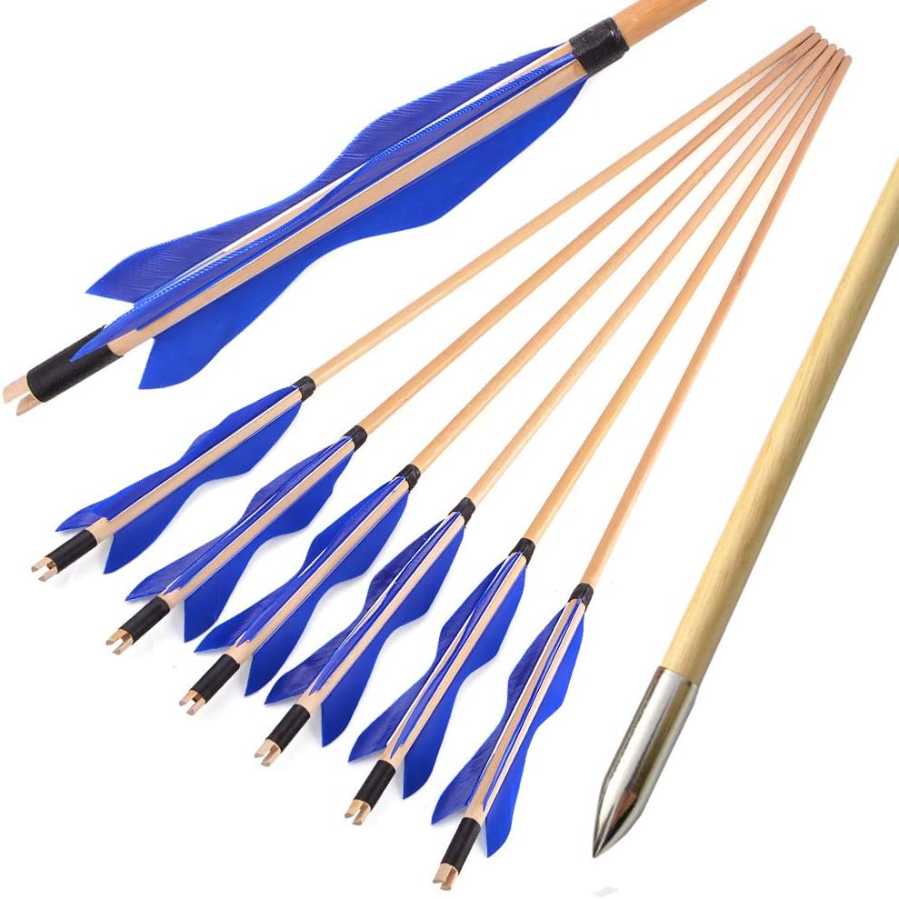 Technical Detail: Color: Black, Blue, Red, Green, Yellow Material: wood Diameter:8mm Arrow shaft Length: 80cm/31.5" Arrow shaft weight: about 24-33.4g Feather: 5'' turkey feathers Arrowhead: about 6g Actual size and weight may vary by manufacturing process Included in the Box: 12x wooden Arrows