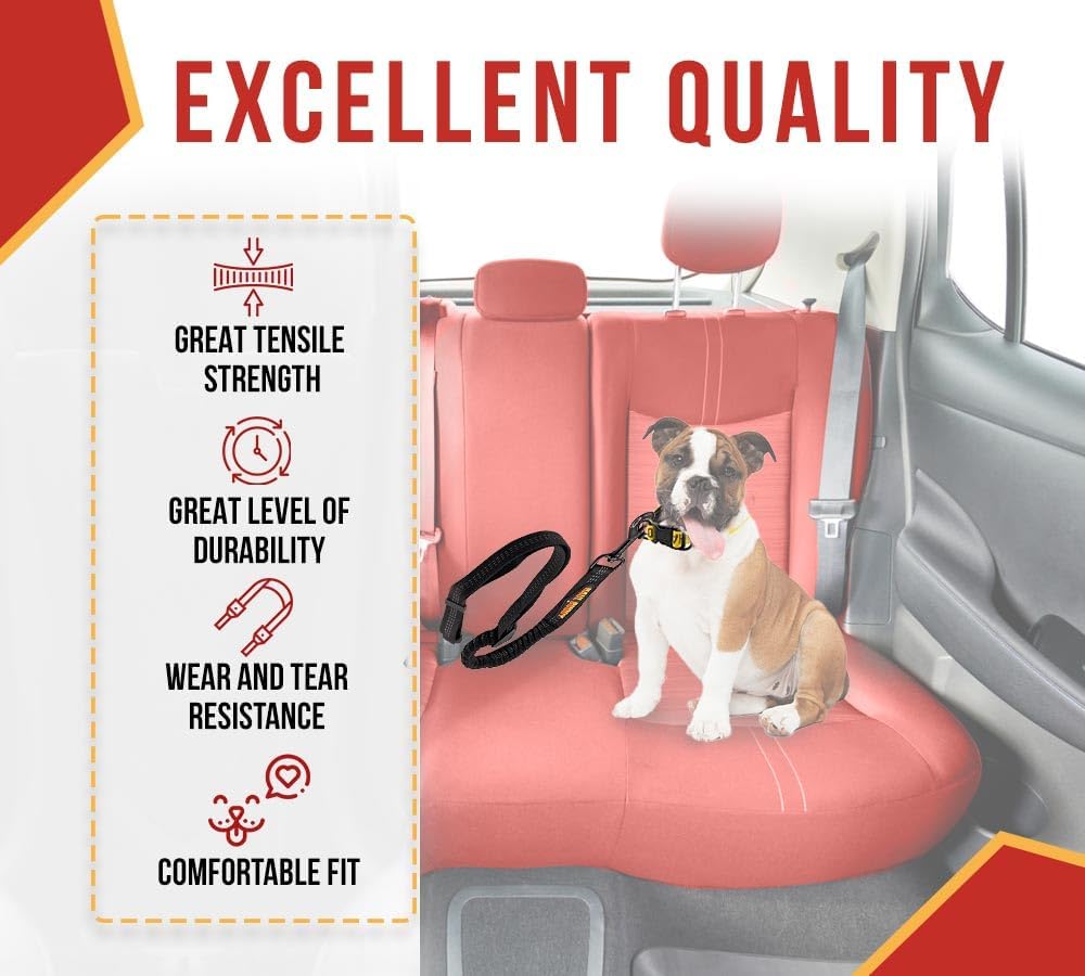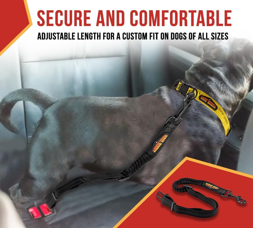 Seat belts for dogs are a very crucial accessory. It safeguards and secures the dogs in vehicles, like cars, trucks, SUVs, or trailers from injury during sudden stops, sharp turns, or collisions (restraining their movement). Understanding the needs and concerns of pet owners, we has added a Nylon Seat Belt for Dogs with an Elastic Buffer Design, and a 360° Rotatable Swivel Clasp. It will keep dogs in place, reducing the risk of drivers getting distracted. It’s not just that, it includes more specifications and features for you to explore:-Sturdy Fabric: Our 1-inch wide seatbelt is engineered from nylon fabric with a jacquard weave to ensure tensile strength. It has reinforced stitches for durability and long-lasting performance over the years while giving comfort to pets. It has great resistance to wear and tear and is designed specifically to protect dogs from a possible choking risk from a vehicle’s seat belt.Universal Seat Clip: You will find a zinc alloy-made seat clip with an overall length of 2-3/8" length (clip 1-5/8") on one end of the dog seatbelt. These have electroplate coating to ensure resistance against corrosion and rust. It is compatible with most seat belt receivers, making it easy to use (clipping and unclipping) in a wide range of vehicles, including cars, trucks, trailers, SUVs, etc.Elastic/Bungee Buffer Design: We have incorporated an elastic-bungee-style buffer design that absorbs shocks during sudden stops or sharp turns. It has an extendable length that goes from 19" to 26". It will reduce the impact on dogs while ensuring comfort and minimizing the jarring motion of the car.Adjustable Buckles/Sliders: Our dog seat belt harness is flexible, allowing you to adjust the length (short or long) for a customized fit based on different-sized dogs (small, medium, large, etc). This will ensure a secure and comfortable fit for your dogs. Moreover, the simple operation will enable quick and easy adjustments. Now, also have a safe and secure walk with a dog collar, neoprene padded leash, and dog poop bag holder amid emergencies.Tangle-Free Movement: One of the best parts of our seat belt is 360-degree swivel movement. It will provide your dog freedom to move without getting tangled, ensuring a comfortable and secure ride. The swivel is made from zinc alloy and has an electroplated coating, which ensures great resistance to wear and tear, rust, and corrosion. You can seamlessly connect to the dog’s harness and not the collar directly (preventing possible suffocation risk). The overall length of the swivel hook is approx 3".Note: Check the buckle’s size before ordering.