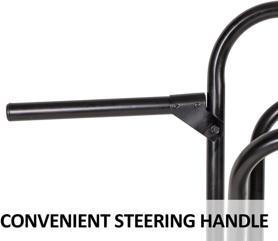 This Easy-Up Folding Saddle Rack on Wheels offers mobile convenience for your equestrian needs. Effortlessly transport your English or Western saddle with 8" all-terrain wheels and a drop-down handle for easy maneuvering. The 9 3/4" long steering handle allows for one-handed operation, freeing your other hand for additional tasks. This rack folds almost completely flat for easy storage when not in use, making it an ideal choice for horse shows and trailers. The bottom webbing straps provide extra storage for grooming totes and bags, keeping them off the ground and clean. Backed by an industry-leading 5-year warranty, this saddle rack is a long-lasting, quality product designed to meet all your saddle storage needs.