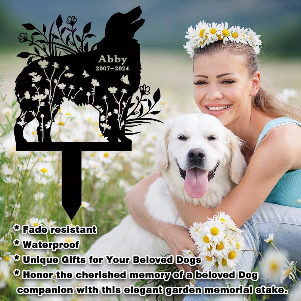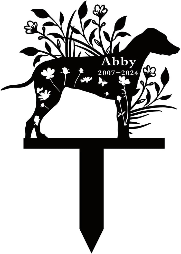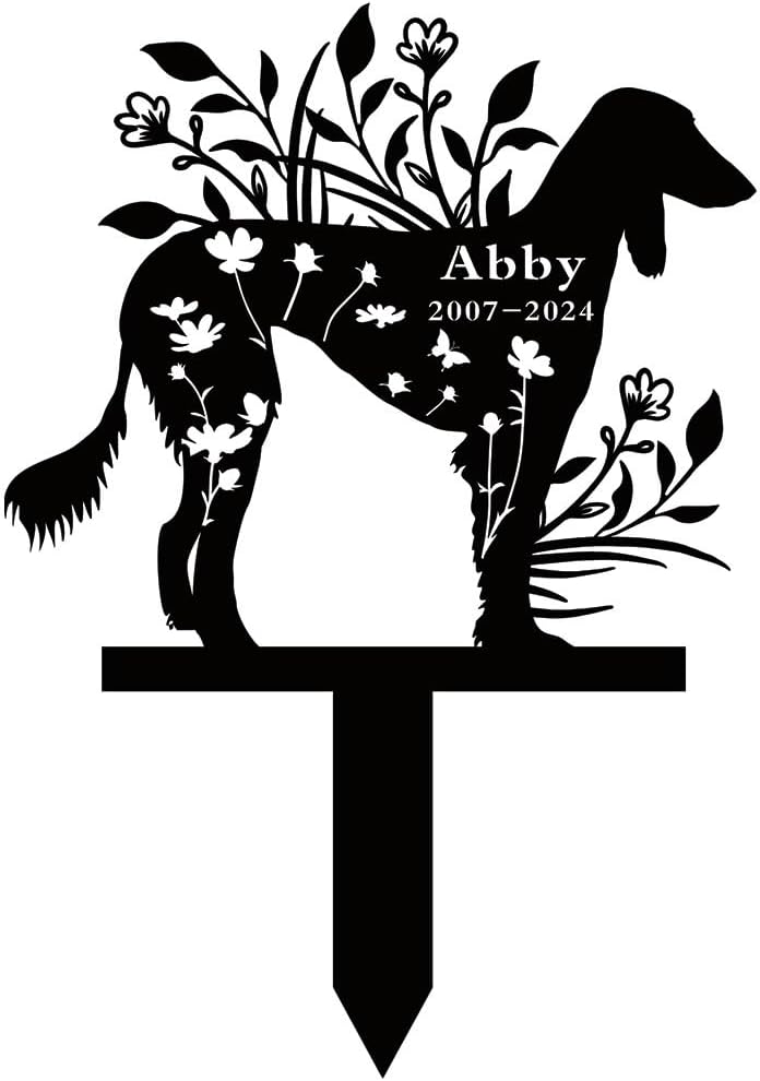 Memory of a beloved canine companion with this elegant garden memorial stake. This black metal stake features a beautiful floral design that gracefully intertwines with the dog's profile. The stake is made from durable metal, making it perfect for outdoor display in gardens, yards, or special memorial spots. The wildflower and flying butterflies details add a touch of natural beauty. This memorial stake can be personalized with dates and dog's name create a lasting remembrance. This thoughtful garden memorial stake as a beautiful way to remember and celebrate the joy and companionship shared with a special four-legged friend.