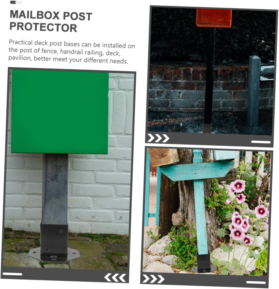 Package List 2 x Post Base Protectors Features -Size:16.00X16.00X9.00cm/6.29X6.29X3.54in deck post bracket -Material:Metal wooden mailbox post -Color:Black mailbox post cover - Simple structure and color, this mailbox post can match with home decoration styles, protect your deck post very well deck post cover. - This mailbox post base is very easy to install, will not easy to deform, can offer you much more convenience post base for mailbox. - Practical deck post bases can be installed on the post of fence, handrail railing, deck, pavilion, better meet your different needs mailbox post protector. - This deck railing base is featured by a sturdy texture, not easy to break, long service post base. - Railing post bases have smooth edges, no burrs, will not scratch your hands during installation, you can use rest assured replacement post base.Goods Informationreplacement post base The deck post bases are very practical and convenient, with texture, serve you for a long time without being easily damaged.square base for railing Using metal materials, the post bases are of high hardness, will not easy to deform or break, you can use rest assured, can be choice for mailbox , deck and more