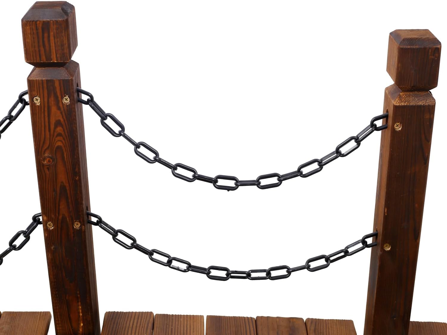 Enhance Your Backyard Oasis: Introduce a touch of rustic elegance to your outdoor space with this charming wooden garden bridge. Ideal for crossing creeks, adding visual appeal to ponds, or creating a picturesque walkway through your garden, this footbridge embodies timeless design that complements a variety of landscape styles. Built to Endure: Crafted from fir wood, this bridge is designed to withstand the test of time. The reinforced structure and thickened beams provide exceptional durability, supporting up to 400 pounds. Additional wood slats at the bottom enhance stability and helps reduce wobbling, ensuring years of reliable use. Weather-Resistant Beauty: A protective finish safeguards the wooden structure from rain, moisture, and the elements, preserving its beauty for seasons to come. and Secure Crossing: Chain railings on both sides provide a sense of security and peace of mind while walking across the bridge. The bridge rests on six sturdy pillars, further enhancing stability and minimizing the risk of accidents. Easy Assembly: We understand the importance of convenience. All necessary hardware and detailed instructions are included, making setup quick and straightforward. The bridge's simple design ensures a hassle-free assembly process, allowing you to enjoy your new addition to your outdoor sanctuary in no time.