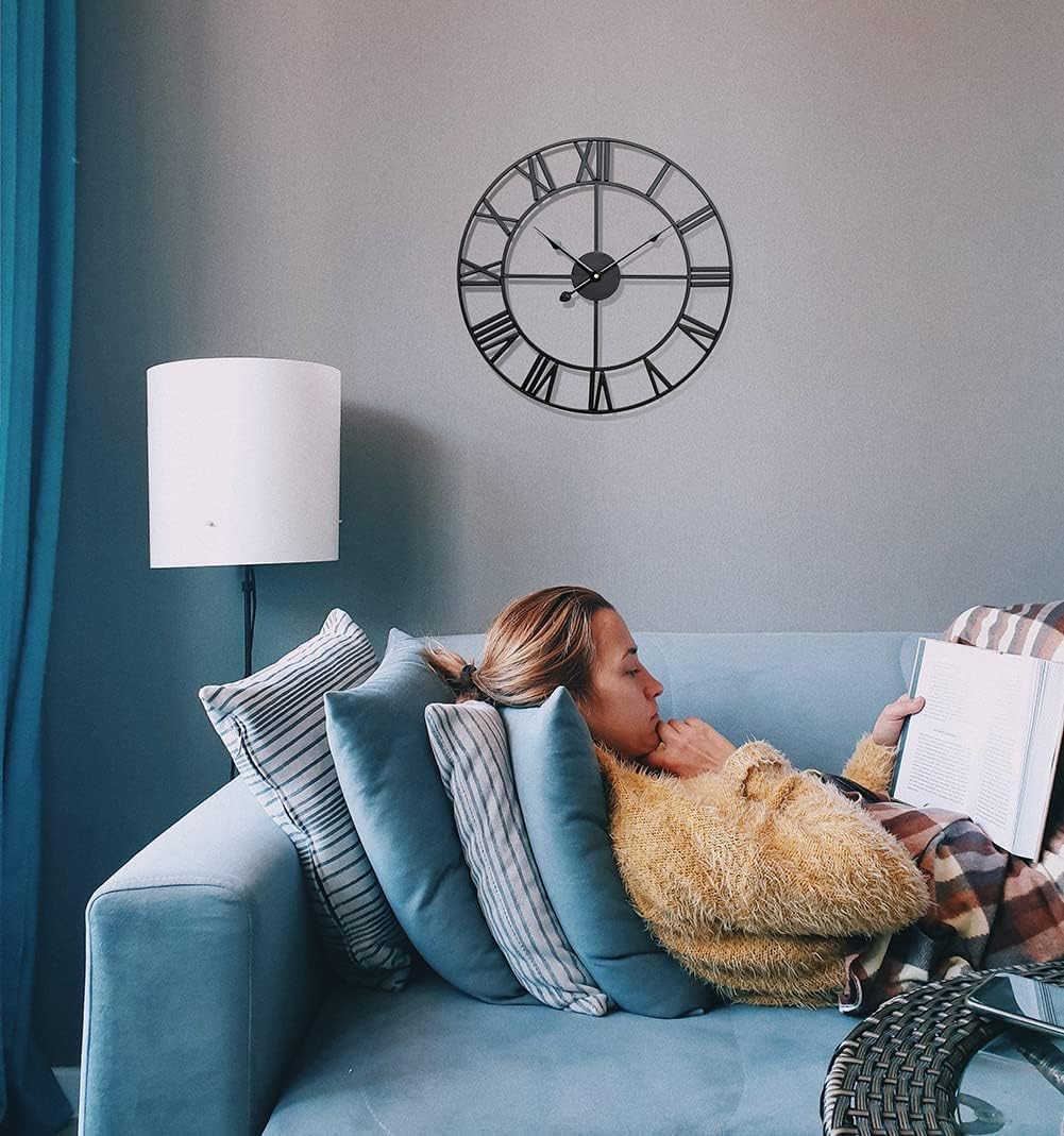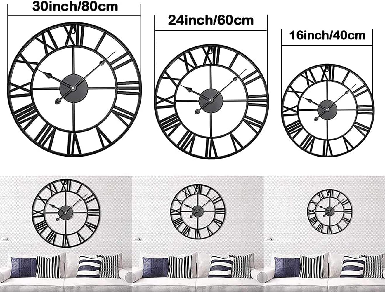 Large Decorative Wall Clock,Oversized Roman Numeral Style Modern Home Decor Ideal for Living Room,Analog Metal Clock,Round (Black)Feature:- DECORATIVE WALL CLOCKS- Whether you are decorating at home or in public places,a retro large wall clock with industrial-style gears is a good choice for you.You can also give it as a gift to family or friends.- EASY TO READ- The three-dimensional numerals make it easy for you to read the time from a distance.- WATERPROOF MOVEMENT- The movement has a waterproof cover to prevent water ingress.3 Easy Steps to Set Up Your New Clock:Step 1: Remove the clock from the box with care.Step 2: Remove the clock‘s backing and insert battery (not included).Step 3: Adjust the time accordingly.Specification:Product name: Outdoor garden vintage wall clockMovement type: QuartzDial Material: MetalShell material: metalMovement type: jumping seconds movementDisplay type: pointer + Roman numeralsColor: BlackSize: 16inch-40cm,18inch-45cm,18.5inch-47cm,24inch-60cm,31.5inch-80cmPacking list:1* huge digital wall clock
