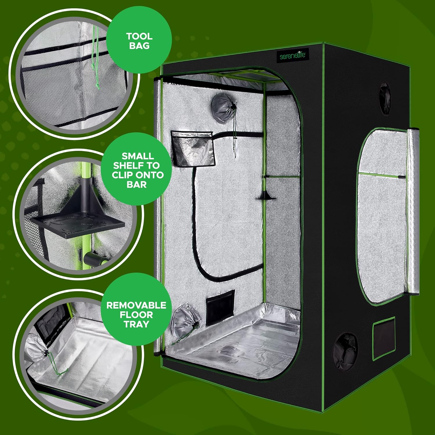 Features: - Reinforced by Heavy Metal Rods, with Durable Zipper - Double Stitching Protection to Ensure Long-Lasting Use - Easily Observe the Plants without Stepping into Tent - Lightweight and Velcro Design - Removable Water-Resistant Floor Tray - Easy to Clean or Wash - Heavy Duty All Steel Poles - Double Duct Port Enclosures - Blocks all Light from Escaping - Adjustable Vent Doors - High-Reflectivity, Carbon Filter Belts - Inner Tool Organizer - Light-Proof SBS Zippers - Effectively Improve Light Efficiency What's in the Box: - Tent Body - Metal Poles: - (4) A Pole - (4) D Pole - (4) B Pole - (4) C Pole - (1) E Pole Hanging Bar Lower - (1) F Pole Hanging Bar Deep - (8) Triangle Connector - (2) Filter Straps - (1) Floor Tray - (1) Pole Shelf - (1) Strengthen Pole Technical Specs: - Construction Materials: 600D Canvas with Metal Poles and Corner Adapters - Maximum Temperature: 80°C - Hanging Bar Weight Capacity: 44 lbs. - Metal Push-Lock Corners: Handle Up to 90 lbs. - Filter Straps Size: 55’’ -inches - Floor Tray Size (L x W x H): 48'' x 24'' x 3.95'' -inches - Hanging Bar Size: 48” -inches and 24” -inches - Pole Shelf Size (L x W x H): 4.72'' x 4.72'' x 2.76'' –inches - Strengthen Pole Size: 48”-inches - Tent Body Size (L x W x H): 48'' x 24'' x 60'' -inches