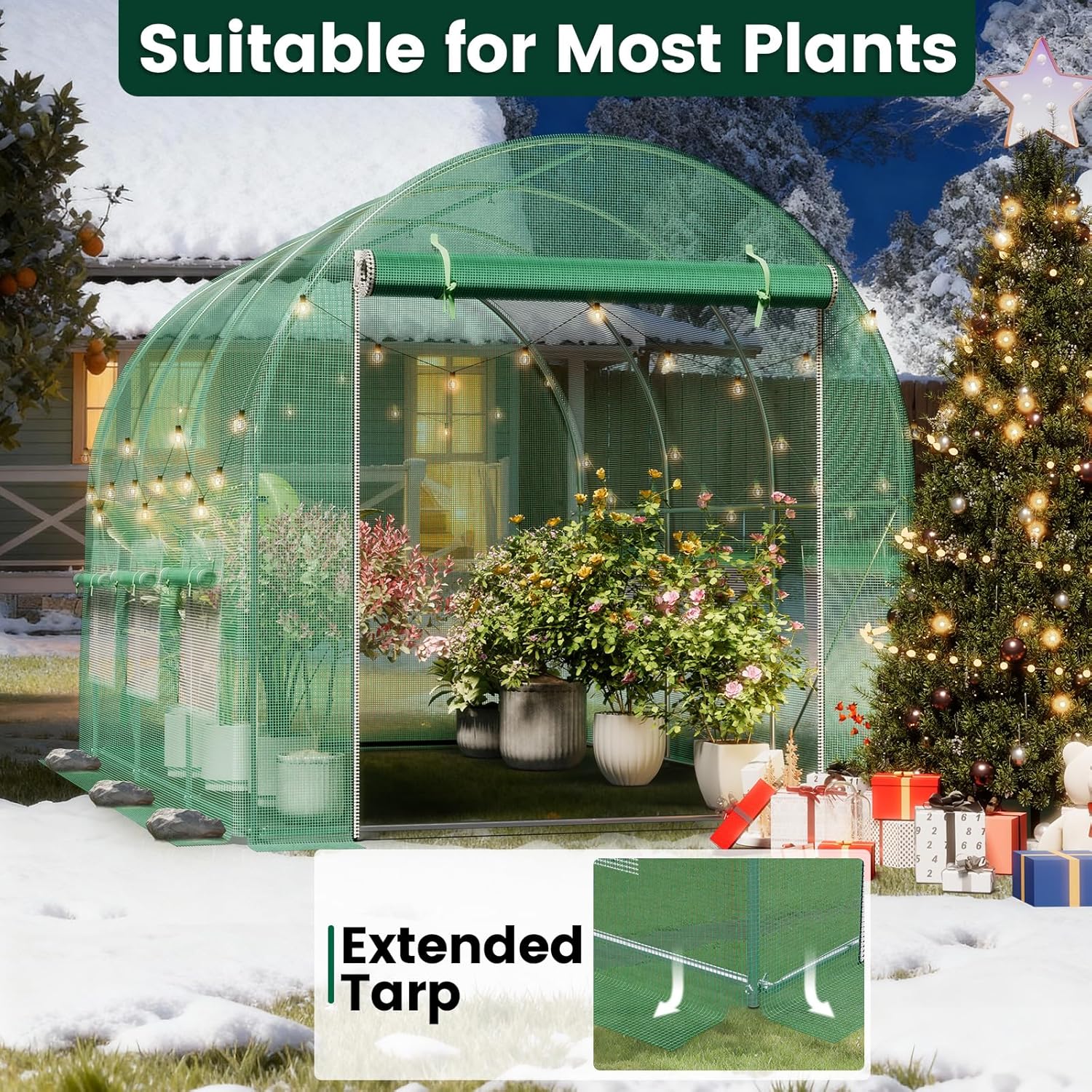 ECOLINEAR Walk-in Hoop House GreenhouseA durable and spacious outdoor greenhouse solution for serious gardeners. This walk-in greenhouse provides a protected, climate-controlled environment to extend your growing season.Heavy-Duty Outdoor Structure: Built with a rust-resistant galvanized steel frame, this hoop house greenhouse is designed as a heavy duty greenhouse for outside, offering stability against the elements.Superior Ventilation System: Features a large zipper door and 6 roll-up mesh windows for optimal airflow and temperature control in this greenhouse for outdoors.High-Capacity Growing Space: The generous walk in greenhouse design allows you to stand comfortably inside to tend to plants, shelves, and tools—far surpassing a basic small greenhouse.All-Season Protection: The 150gsm PE cover creates a reliable green house environment. Extended edges can be buried for enhanced sealing.Complete & Practical Kit: This comprehensive greenhouse kit includes all necessary parts for straightforward assembly, making it a versatile portable greenhouse or permanent garden feature.Grow more, all year round.