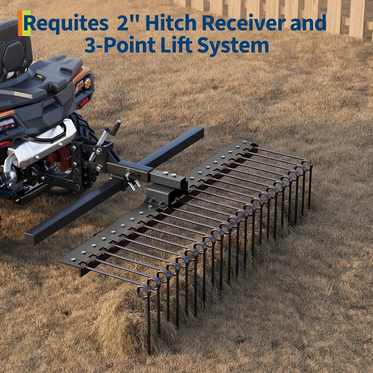 Professional Pine Straw Landscape Rake – Heavy-Duty Attachment for Efficient Lawn, Farm, and Ranch MaintenanceUpgrade your yard, pasture, or field maintenance with this heavy-duty pine straw landscape rake, purpose-built for both residential and commercial landscaping. Compatible with most lawn tractors, ATVs, and UTVs equipped with a standard 2-inch receiver hitch, it transforms your vehicle into a powerful yard cleanup tool.Rugged Construction: Crafted from all-steel and finished with a durable powder coating, this rake resists rust, corrosion, and everyday wear, ensuring reliability across all seasons.Flexible Size Options: Choose between 48-inch (with 17 or 20 tines) and 60-inch (with 21 tines) working widths for fast coverage of large areas and efficient cleanup of pine needles, straw, leaves, grass clippings, and light yard debris.Superior Tine Design: Featuring heat-treated spring steel or coil tines that flex to handle uneven terrain without damaging turf. Each tine is individually replaceable, reducing maintenance costs and extending the life of your equipment.Easy Attachment & Operation: Global fit with 2-inch receiver hitch. The tow-behind design glides smoothly over grass without scalping and assembles quickly with the included hardware and instructions.Versatile Applications: Ideal for dethatching, soil aeration, and year-round debris removal on lawns, pastures, gardens, and farm fields. Perfect for homeowners, ranchers, and professional landscapers.Package Includes: Landscape rake, hardware pack, user manual.Usage Guidelines: Confirm your hitch compatibility before installation. Inspect and secure all fasteners before each use. Store in a dry, sheltered area to maximize longevity. For tractors with only a 3-point hitch, a 3-point to 2-inch receiver adapter is required (not included). For best results, use on level, debris-covered turf or soil.