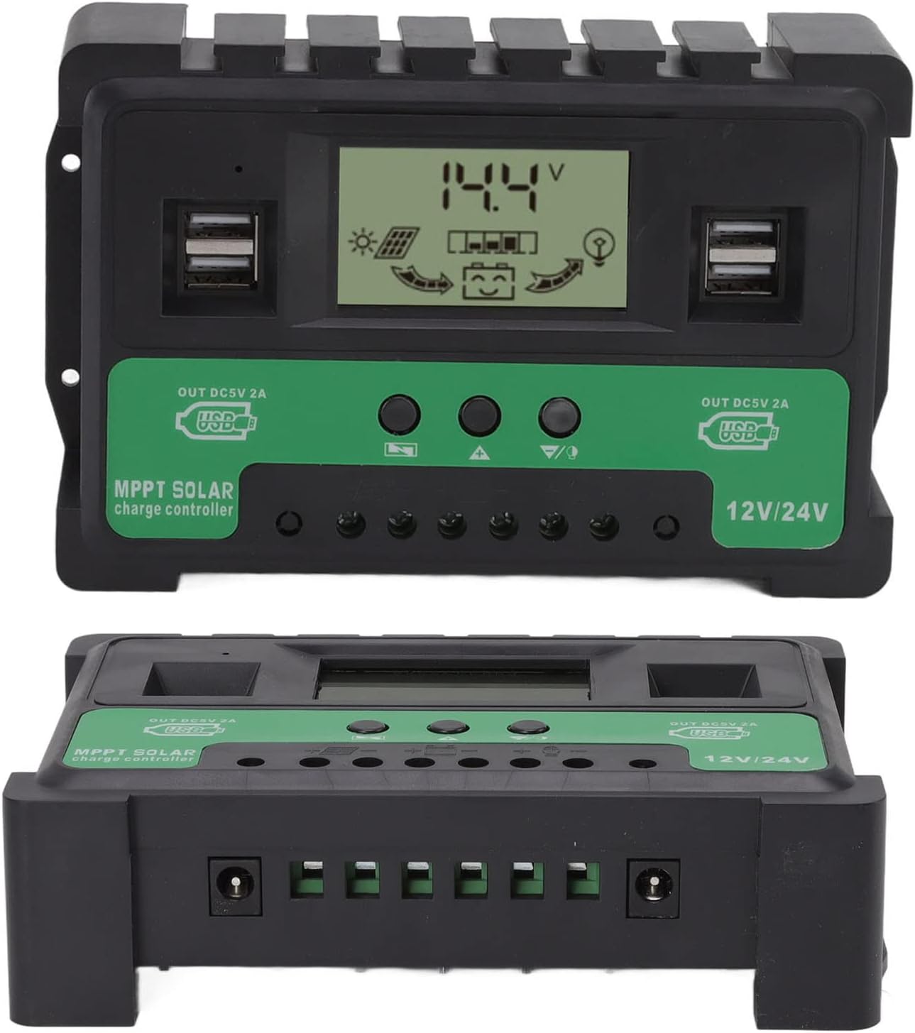 Item Type: Solar ControllerProduct Size: Approx. 16.5 x 10.5 x 4.5cm / 6.5 x 4.13 x 1.77inSystem Voltage: 12V 24V automatic adaptation. Maximum Photovoltaic Voltage: 23V maximum at 12V battery, 46V maximum at 24V battery. USB Output: 4 way USB output, 5V 2.5A maximum. Standby Current: Working Temperature: -35℃ - +60℃Function: Solar ControllerWeight: 313 g / 11.04 oz(approx.)Material: ABSPackage List:1 xSolar Controller1 x User Manual