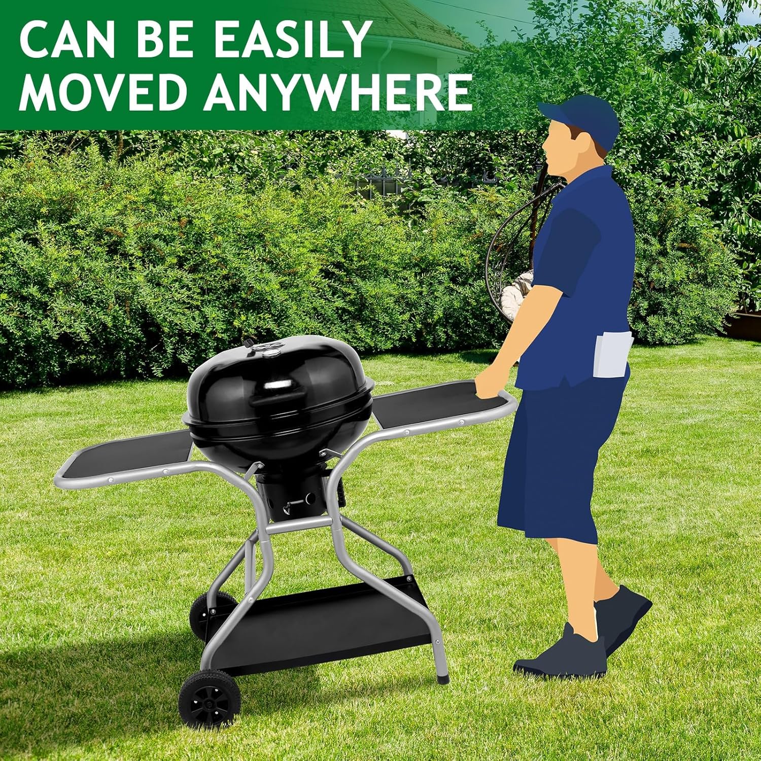 Material: Porcelain Enamel, Chrome Plated, Galvanized Steel Dimensions: 50.4 x 25.2 x 39.4 inch / 128 x 64 x 100 cm Wall Thickness: 0.7 mm Side Table Dimensions: 14.2 x 17.3 x 0.9 inch / 36 x 44 x 2.3 cm Kettle Diameter: 22.3 inch (outer) / 21.4 inch (inner) / 56.6 cm (outer) / 54.3 cm (inner) Lid Diameter: 22.6 inch (outer) / 21.9 inch (inner) / 57.3 cm (outer) / 55.8 cm (inner) Raised Cooking Grid: 15.7 x 11.8 x 5.6 inch / 40 x 30 x 14.2 cm Support Pole Length: 6.7 inch / 17 cm Grill Clip Dimensions: 10.2 x 1.6 inch / 26 x 4 cm Large Grill Grid Diameter: 21.3 inch / 54 cm Small Grill Grid Diameter: 15.4 inch / 39 cm (for charcoal basin opening) Charcoal Basin Diameter: 6.3 inch / 16 cm, Height: 5.1 inch / 13 cm Bottom Storage Shelf Dimensions: 26.4 x 18.2 x 1.2 inch / 67 x 46.2 x 3 cm Wheel Diameter: 6.7 inch / 17 cm Thermometer Diameter: 2 inch / 5.2 cm Net Weight: 40.1 lbs / 18.2 kg