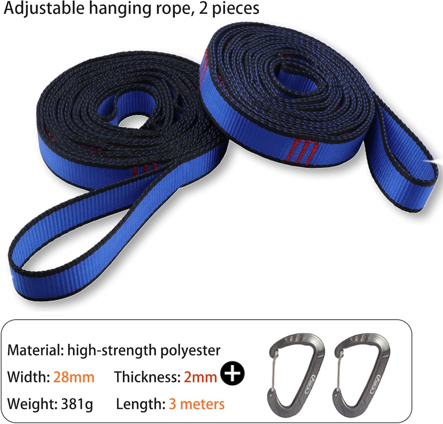Adjustable hammock straps, two packMaterial: high-strength widened polyesterLength 3 meters (with 21 adjustable hanging rings) Width: 28mm Thickness: 2mmWeight: about 381gWeighing: 2200 kgPackage: 2 pieces of Swing Hanging Straps, and 2 pieces quick hangUse scenarios:Ideal for classic swings, garden swings, children's swings, etc. It can also be used for hammocks, swing chairs, and a wide range of applications to meet your needs- Hammock matching quick hang:1. High strength load-bearing 1200 kg2. Steel wire door design, press to open and close more firmly3. Aluminum alloy casting 12KN4. Longitudinal breaking load 12KN (about 1200 kg)Easy to install and transport: The installation of the swing belt kit is very simple and can be completed in a few simple steps without tools.Ultimate Outdoor Adventure: Elevate your outdoor experience with our Outdoor Hammock Straps! Designed for strength, these straps can hold up to 2200kg, ensuring you and your loved ones enjoy a worry-free swing under the stars.