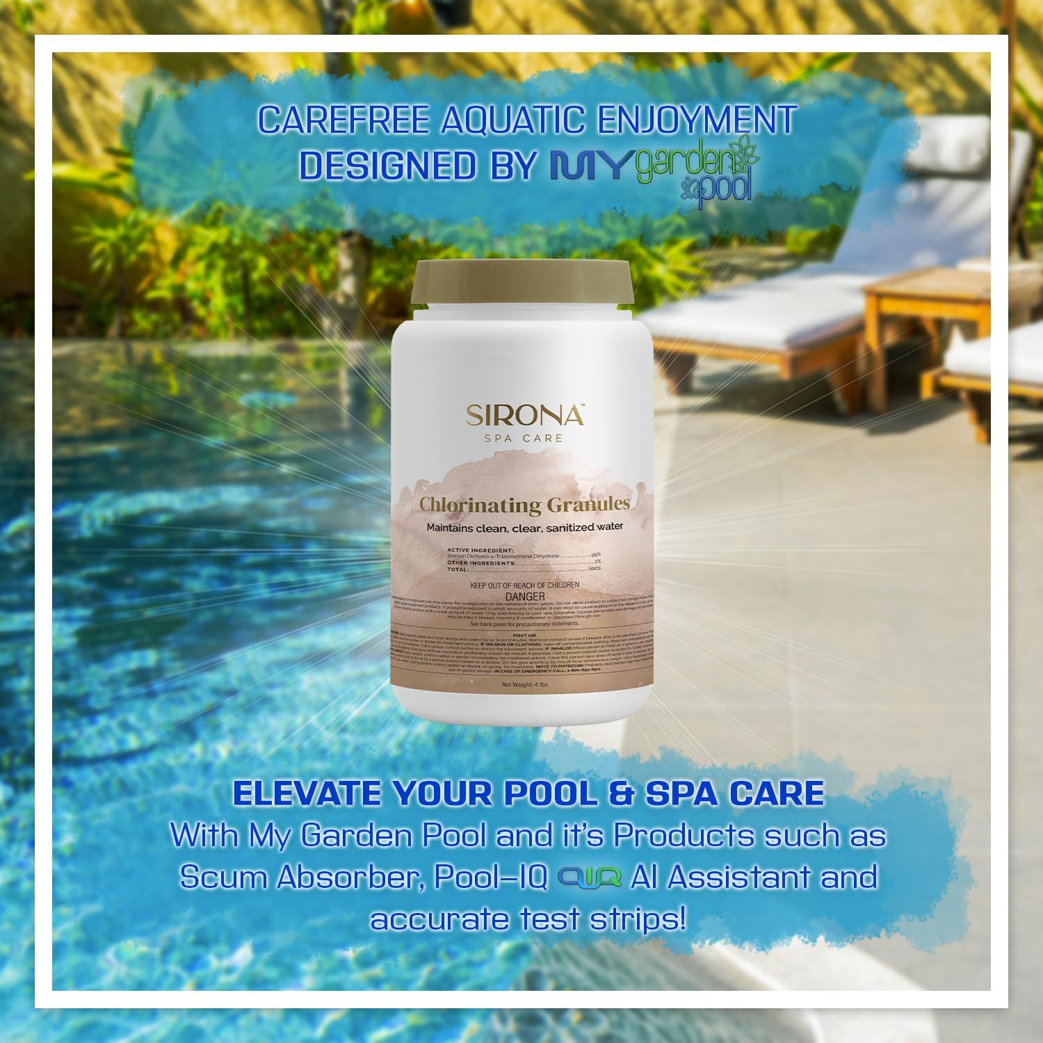 Keep your spa and hot tub water clean, clear, and properly sanitized with Sirona 82132 Chlorinating Granules, a fast-dissolving and effective sanitizer designed to eliminate bacteria, control algae, and break down organic contaminants. Maintaining proper chlorine levels is essential for healthy water balance, preventing cloudiness, odors, and bacterial growth while ensuring a safe and enjoyable soaking experience. This all-in-one maintenance bundle also includes My Garden Pool 20 Ct. 7-in-1 Test Strips, providing a quick and accurate way to monitor essential spa water parameters, including chlorine levels, pH, alkalinity, and calcium hardness. Regular testing ensures your spa remains properly balanced and sanitized, reducing the need for frequent chemical adjustments. Additionally, the Flower Scum Absorber is included to trap oils, lotions, and debris, helping to prevent scum buildup and maintain longer-lasting, clearer water. By reducing contaminants, this sponge improves filtration efficiency, ensuring better overall spa performance. Sirona 82132 Chlorinating Granules is compatible with all spa and hot tub systems, including chlorine-based and saltwater systems. The fast-dissolving formula allows for easy application, quickly sanitizing water without leaving residue. Simply follow the dosage instructions to maintain optimal chlorine levels and keep your spa water fresh and inviting. With Sirona’s premium chlorinating granules, My Garden Pool’s precision test strips, and the Scum Sponge’s effective absorption, this all-in-one kit ensures your spa stays sanitized, balanced, and crystal clear.