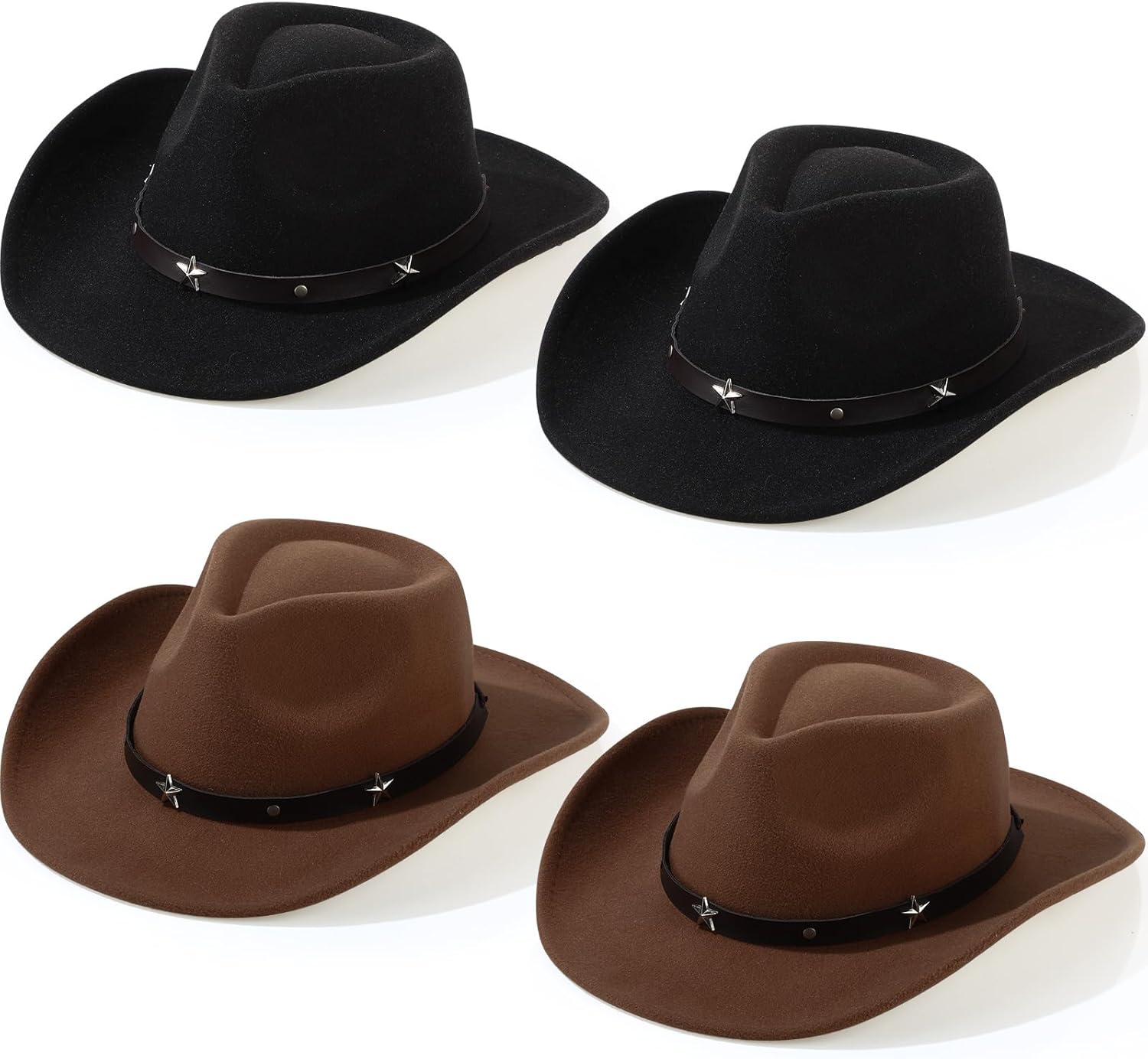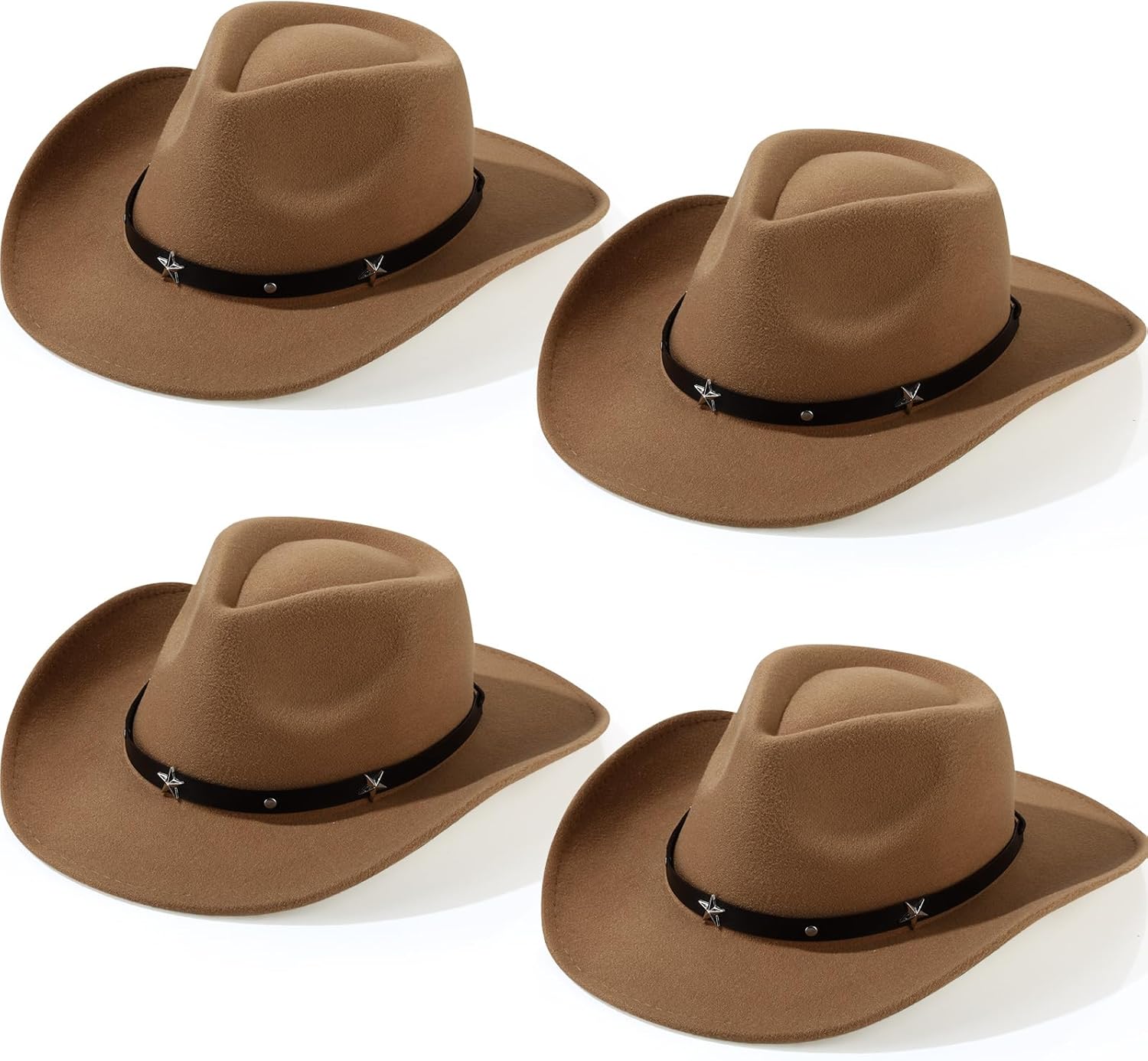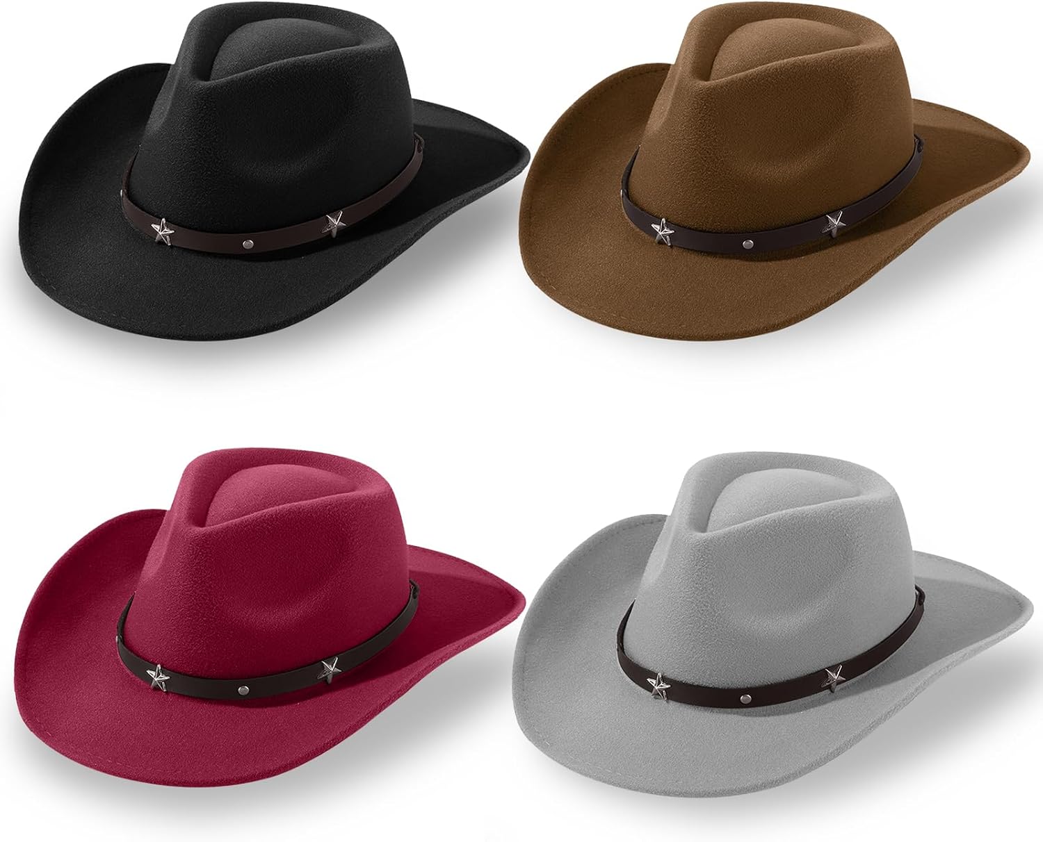 Features: These women's felt hats with brim come in black, camel, khaki, coffee, which are easily matched for your diverse dresses, skirts, pants, jeans, shirts, sweaters, coats, sportswear and other stylish clothing, making you attractive and charming. Our men's women's western hats are suitable for a wide range of occasions, such as parties, weddings, concerts, birthdays, festivals, school plays, etc., and can also be applied for daily wear. Specifications: Material: mainly felt, polyester and cotton Color: black, camel, khaki, coffee Size: approx. 22.44-22.83 inches/ 57-58 cm in head circumference, 4.72 inches/ 12 cm in depth Package includes: 4 x Western cowboy hats Notes: Manual measurement, please allow slight errors on size. The color may exist a slight difference due to different screen displays.