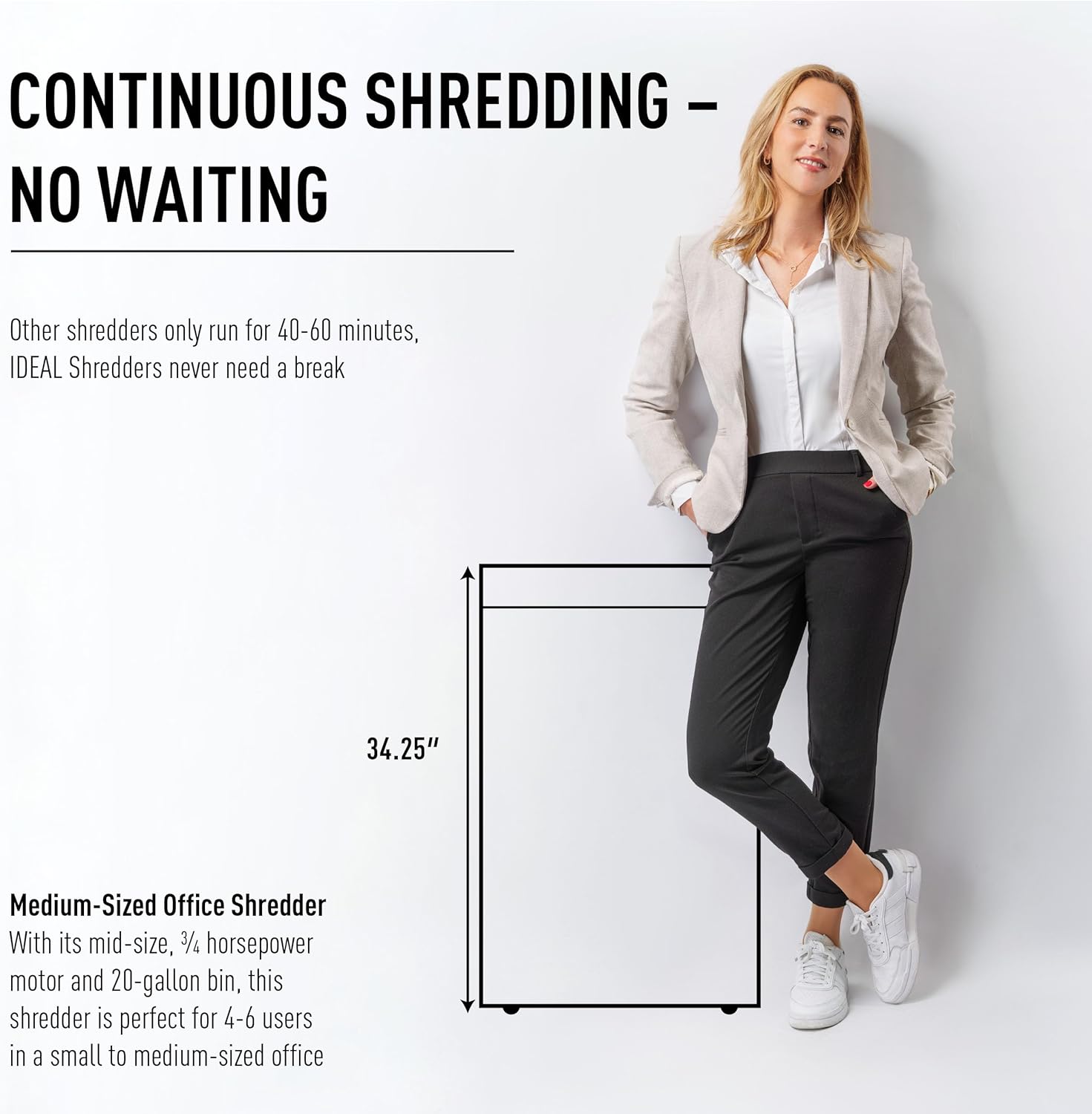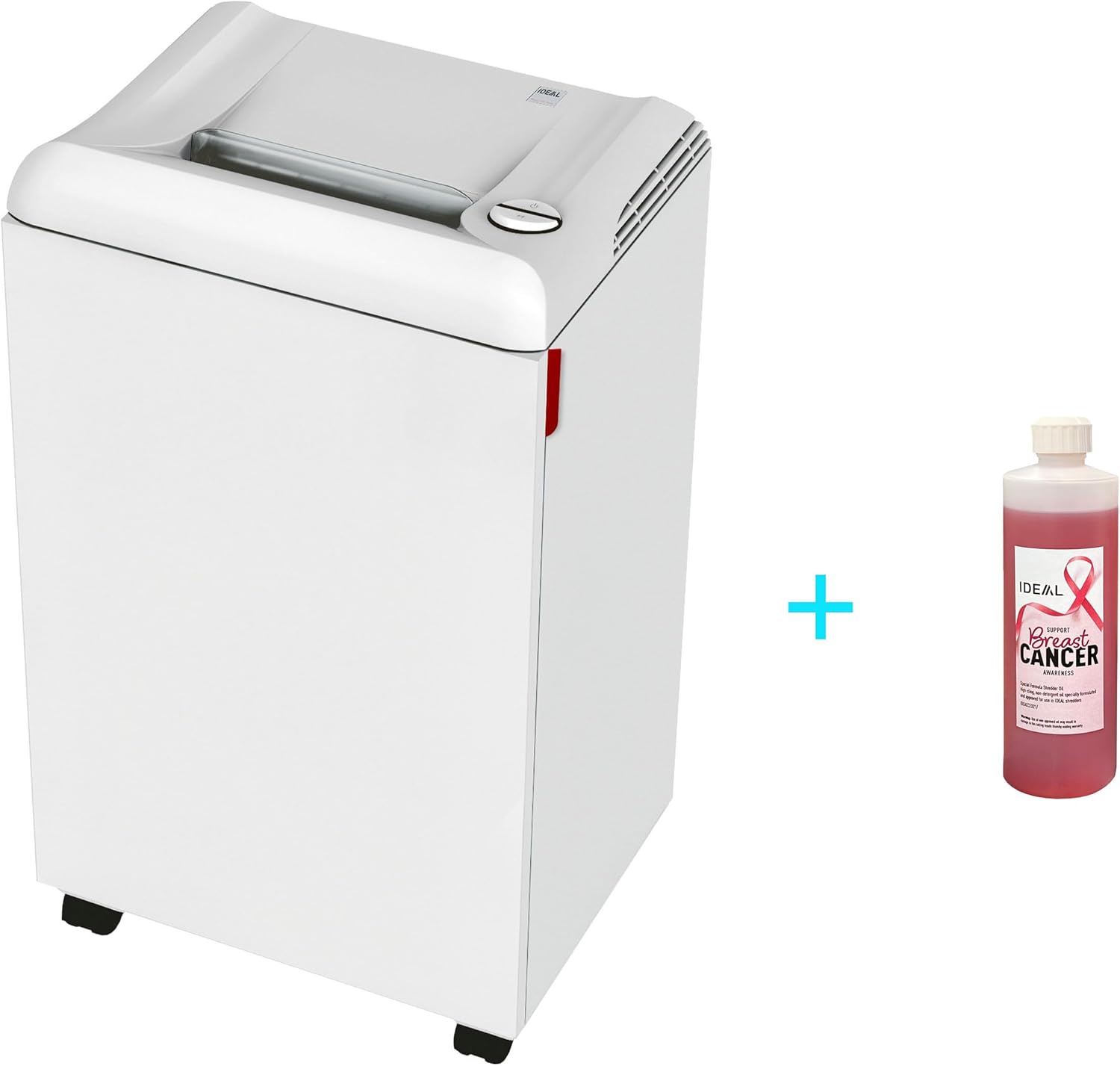 The IDEAL 2503 Cross-Cut Paper Shredder P-5 is a compact, yet powerful commercial office shredder designed for small offices and departments with up to 6 users. Built for centralized shredding, this high-security P-5 shredder delivers continuous, reliable performance with solid steel cutting heads that minimize downtime while effortlessly shredding paper, staples, paper clips, and credit cards. Engineered and manufactured in Germany, the IDEAL 2503 features a quiet yet powerful 3/4 HP single-phase motor that shreds up to 10 sheets at a time and processes up to 262 sheets per minute, making it an ideal solution for growing office shredding needs. The 10.25” feed opening allows for easy document insertion, while the patented electronically controlled transparent safety shield helps protect hands and fingers during operation. This HIPAA- and FACTA-compliant paper shredder is certified to destroy Personally Identifiable Information (PII) and Controlled Unclassified Information (CUI), making it a federally accepted shredder for protecting sensitive documents and preventing identity theft. Its impact-resistant, lightweight 20-gallon bin is easy to remove, and the high-quality wooden cabinet on casters provides durability and smooth mobility within the office. Designed for long-term reliability, the IDEAL 2503 is backed by a lifetime warranty on cutting shafts and wheels, a 3-year limited warranty on parts (excluding wear items), and a 90-day labor or exchange warranty at IDEAL’s discretion. Each shredder includes 1 pint of IDEAL Pink Shredder Oil to help maintain peak performance. Perfect for small offices, departments, and professional environments, the IDEAL 2503 delivers high-security shredding, quiet operation, and German-engineered quality you can count on for years of trouble-free use.