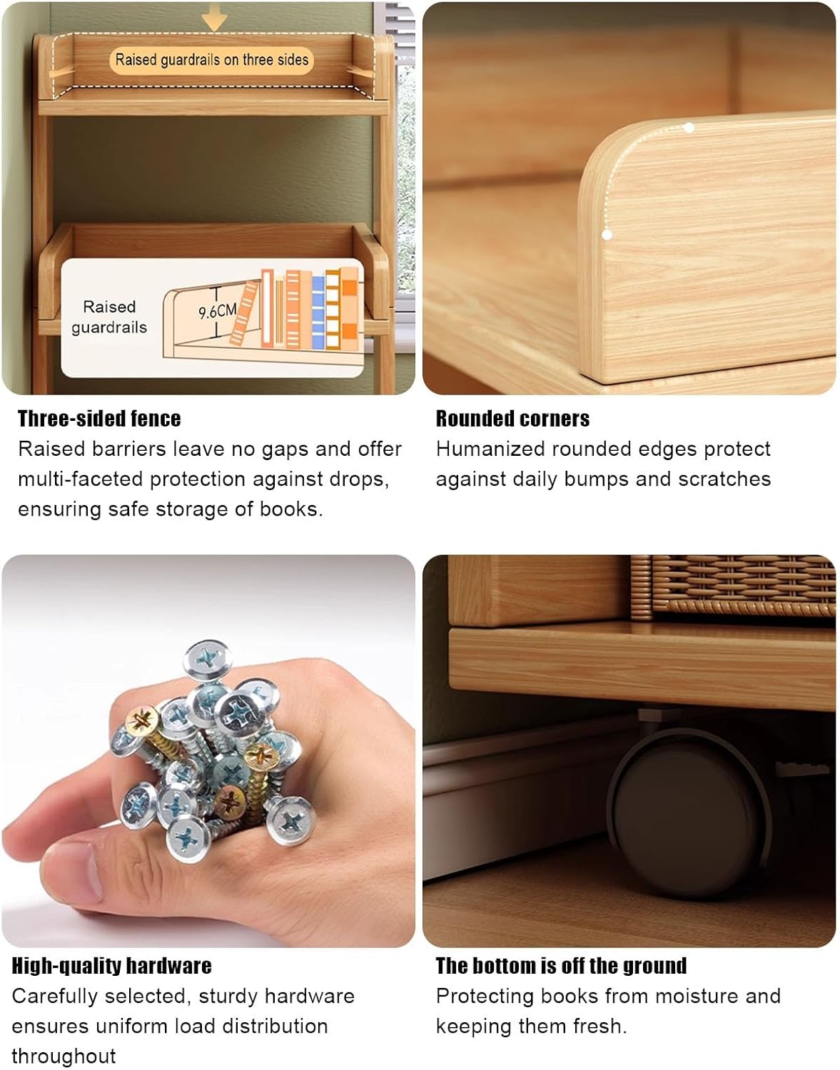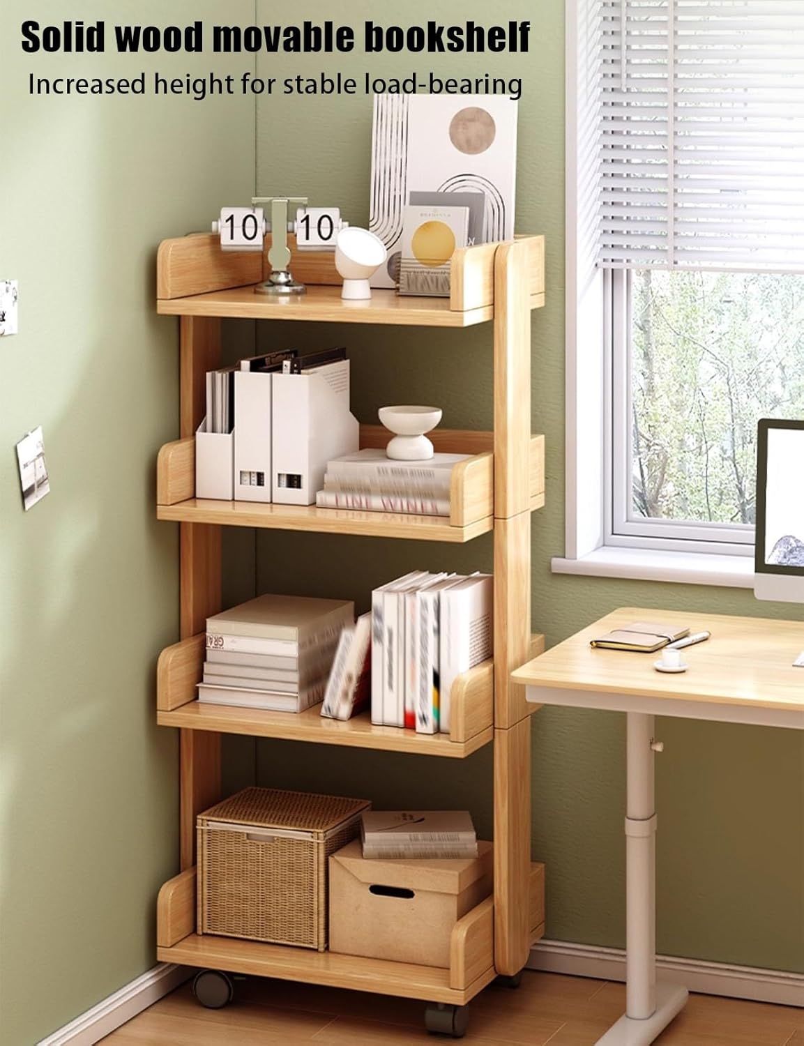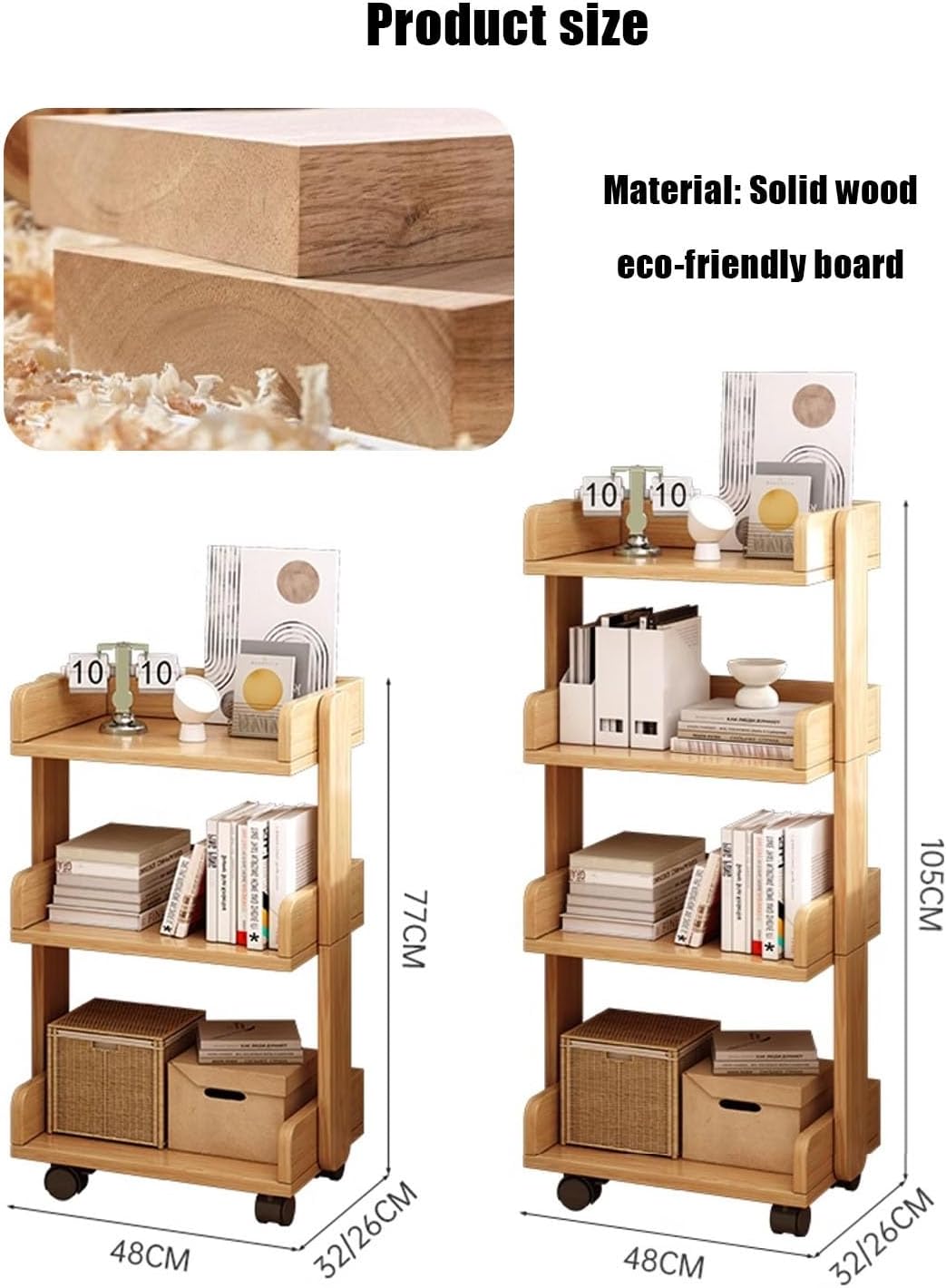 About the Product: Our mobile bookshelf is perfect for maximizing storage space in any home office or quiet space like a library, helping you expand your desktop space. It's ideal for limited spaces such as art studios, computer rooms, and reading rooms.How to Use:Assembly: Simply assemble the solid wood eco-board shelves and frame; no complicated tools required for quick installation.Moving and Fixing: Easily move the bookshelf by pushing the casters for 360° free rotation. To fix it, activate the brakes to ensure stability.Material: Solid wood eco-boardDimensions: 3Tier: 48x32x77cm4Tier: 48x32x105cmLoad Capacity: 200LBSMoving Accessories: 360° castersSuitable Scenarios: Study, living room, home display/storage scenariosPackage Includes:1 x Book Trolley
