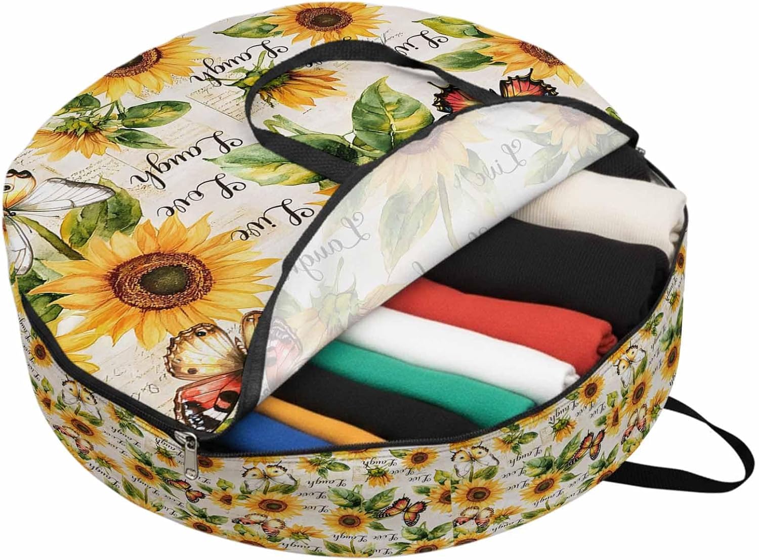 Reclaim Your Closet Space with the Round Storage Solution! Material: polyester Diameters: 24 inch, 30 inch, 36 inch Depth: 7 inches Package Includes: Round Storage Bag One Bag, Endless Possibilities: Whether you are swapping out your summer wardrobe, moving into a new dorm, or packing away holiday decorations, this bag has you covered. The circular design is uniquely suited for: Bedding: Comforters, quilts, sheet sets, and oversized pillows. Clothing: Winter coats, sweaters, and bulky ski gear. Home Decor: Holiday wreaths, garlands, and floral arrangements. Outdoor Gear: Camping blankets, sleeping bags, and beach towels. Dual Zippers: The high quality double zipper design allows the closet organizer to open wide from both sides, making it effortless to load and unload even the bulkiest comforters or wreaths. Reinforced Handles: Sturdy, reinforced handles are securely stitched to provide extra strength and a comfortable grip when carrying heavy loads or pulling the bag from under a bed. Clear Label Pocket: A transparent built-in label holder allows you to quickly identify the contents of each bag without ever having to unzip it, keeping your storage perfectly organized.