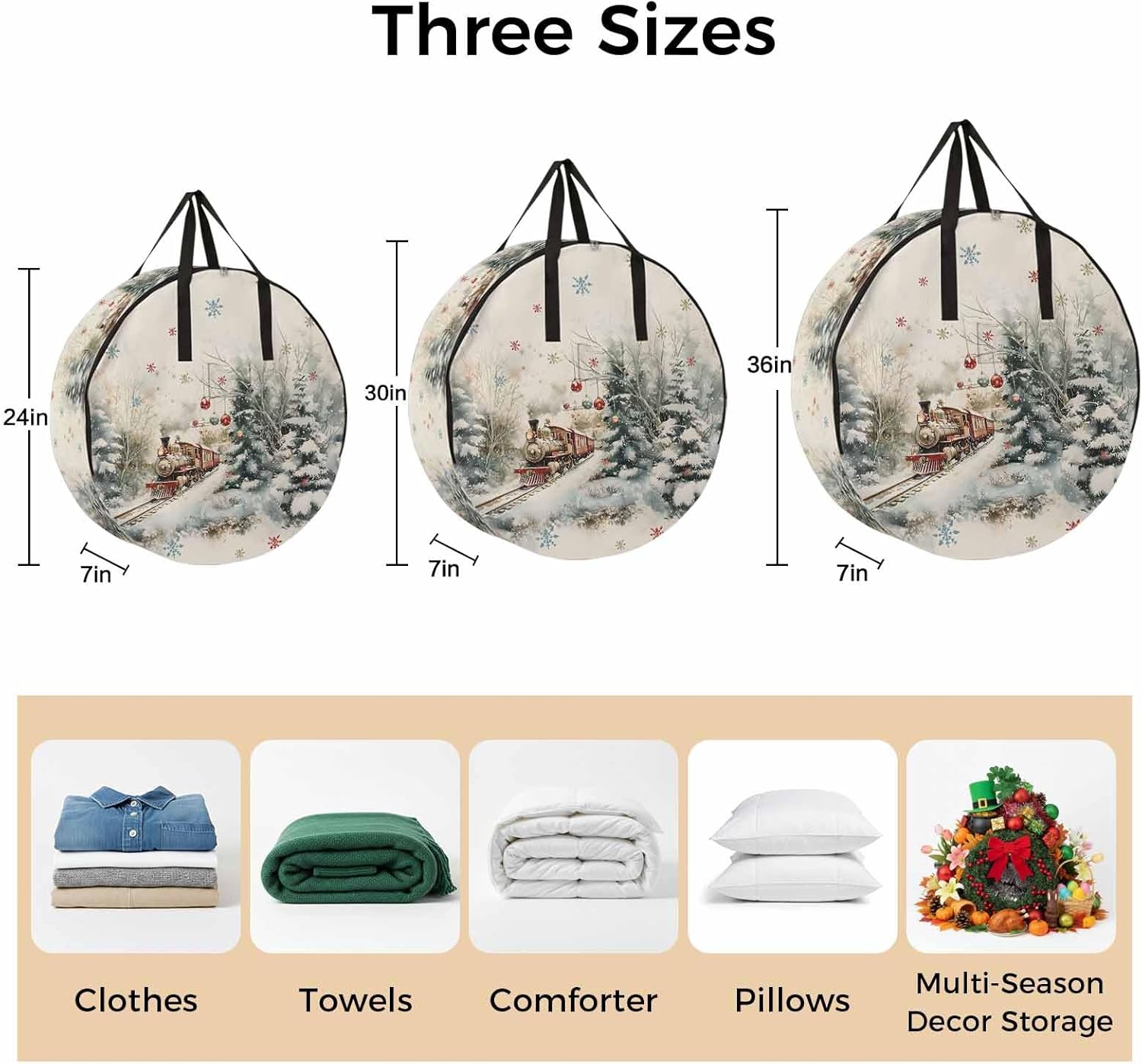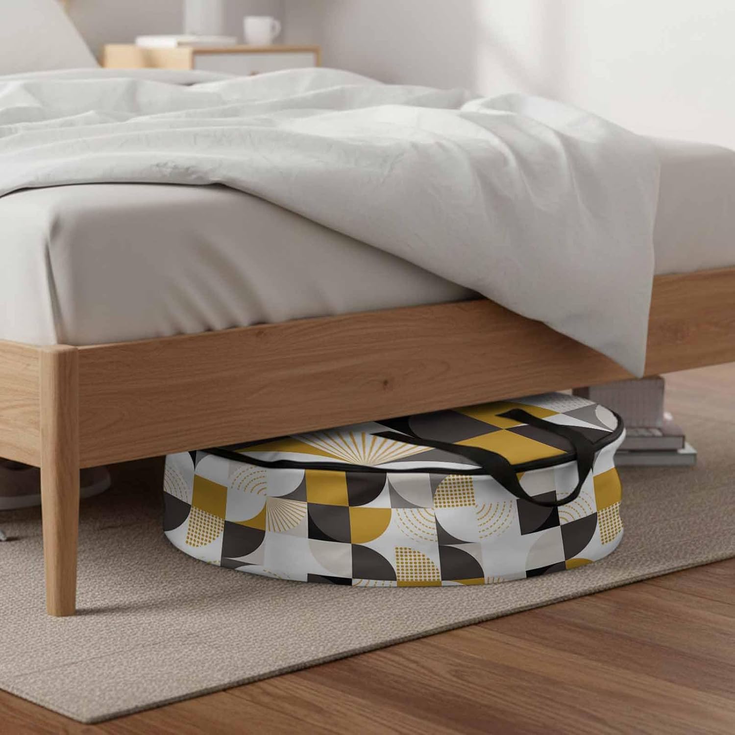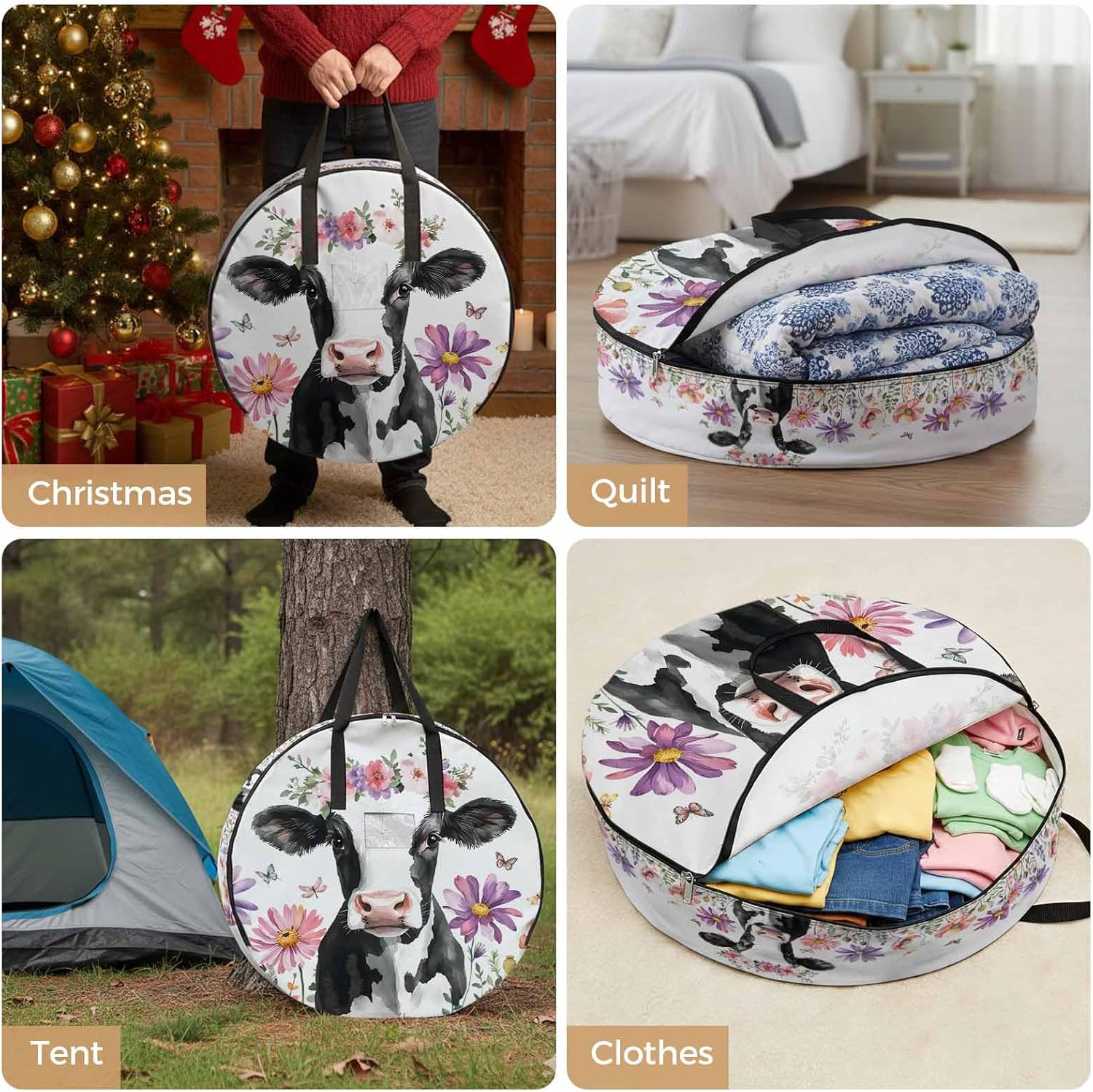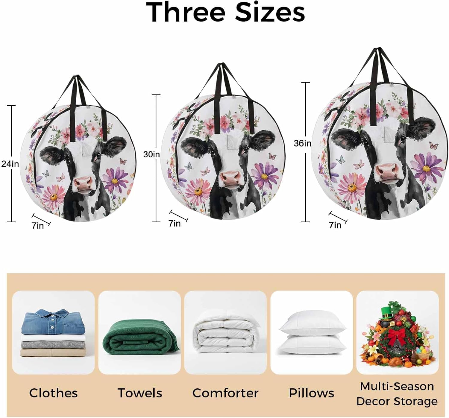 Reclaim Your Closet Space with the Round Storage Solution! Material: polyester Diameters: 24 inch, 30 inch, 36 inch Depth: 7 inches Package Includes: Round Storage Bag One Bag, Endless Possibilities: Whether you are swapping out your summer wardrobe, moving into a new dorm, or packing away holiday decorations, this bag has you covered. The circular design is uniquely suited for: Bedding: Comforters, quilts, sheet sets, and oversized pillows. Clothing: Winter coats, sweaters, and bulky ski gear. Home Decor: Holiday wreaths, garlands, and floral arrangements. Outdoor Gear: Camping blankets, sleeping bags, and beach towels. Dual Zippers: The high quality double zipper design allows the closet organizer to open wide from both sides, making it effortless to load and unload even the bulkiest comforters or wreaths. Reinforced Handles: Sturdy, reinforced handles are securely stitched to provide extra strength and a comfortable grip when carrying heavy loads or pulling the bag from under a bed. Clear Label Pocket: A transparent built-in label holder allows you to quickly identify the contents of each bag without ever having to unzip it, keeping your storage perfectly organized.