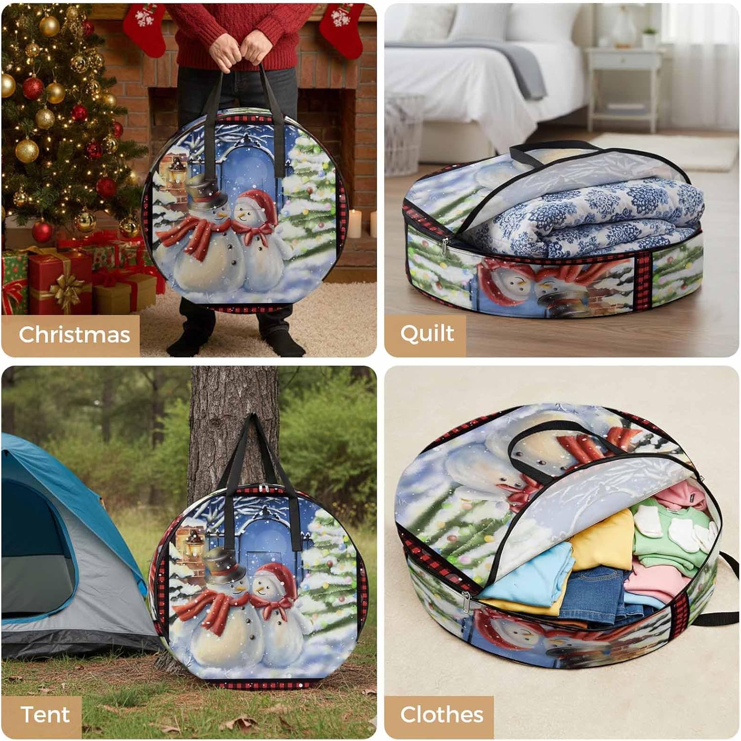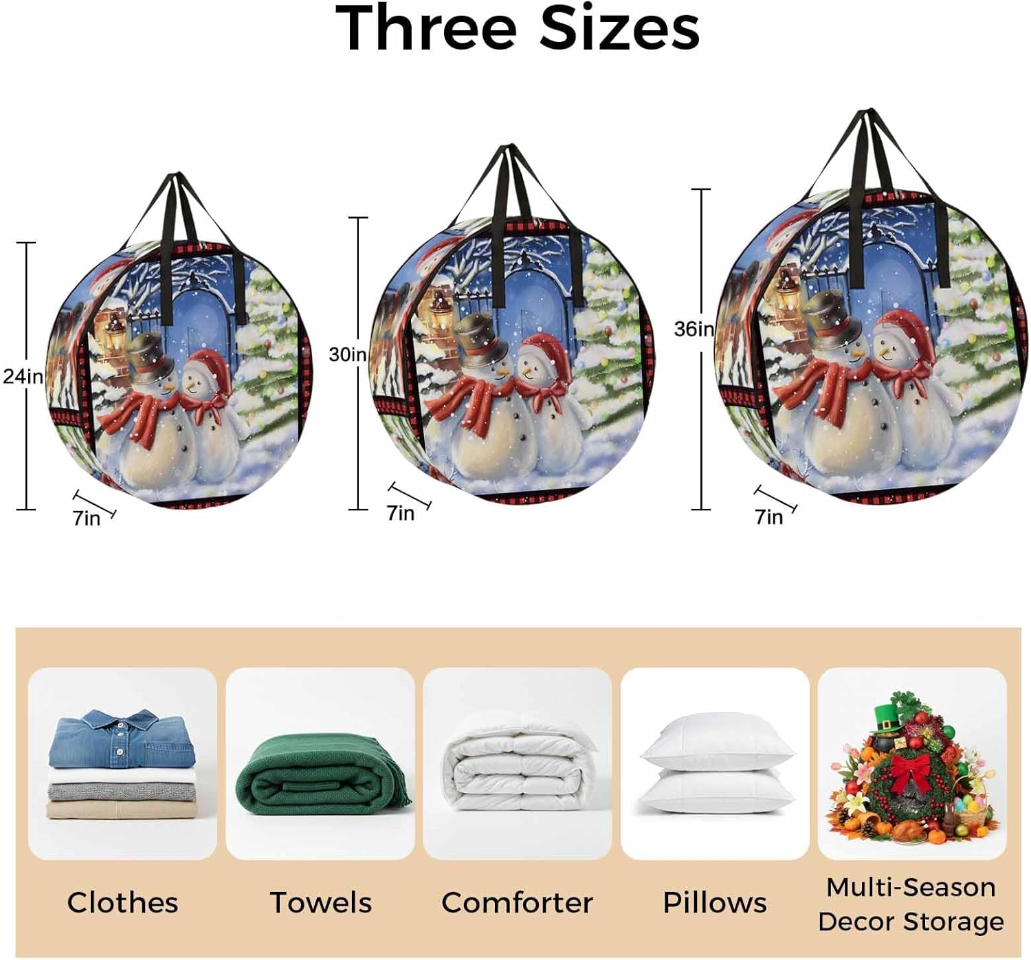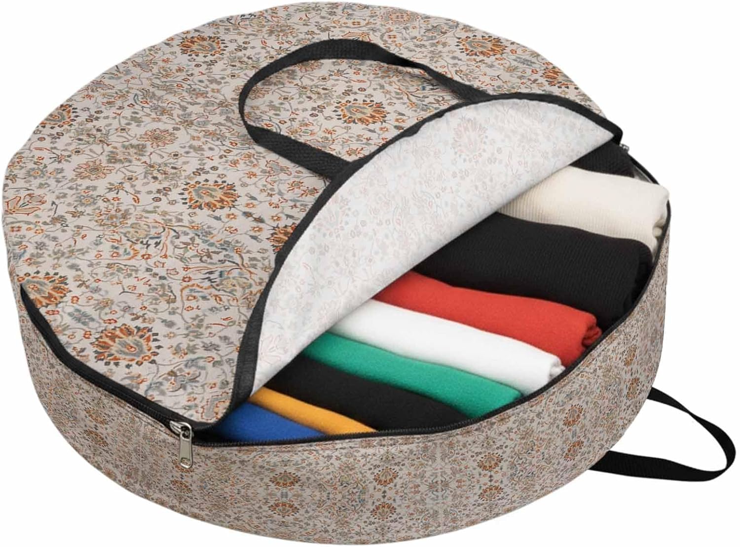 Reclaim Your Closet Space with the Round Storage Solution! Material: polyester Diameters: 24 inch, 30 inch, 36 inch Depth: 7 inches Package Includes: Round Storage Bag One Bag, Endless Possibilities: Whether you are swapping out your summer wardrobe, moving into a new dorm, or packing away holiday decorations, this bag has you covered. The circular design is uniquely suited for: Bedding: Comforters, quilts, sheet sets, and oversized pillows. Clothing: Winter coats, sweaters, and bulky ski gear. Home Decor: Holiday wreaths, garlands, and floral arrangements. Outdoor Gear: Camping blankets, sleeping bags, and beach towels. Dual Zippers: The high quality double zipper design allows the closet organizer to open wide from both sides, making it effortless to load and unload even the bulkiest comforters or wreaths. Reinforced Handles: Sturdy, reinforced handles are securely stitched to provide extra strength and a comfortable grip when carrying heavy loads or pulling the bag from under a bed. Clear Label Pocket: A transparent built-in label holder allows you to quickly identify the contents of each bag without ever having to unzip it, keeping your storage perfectly organized.