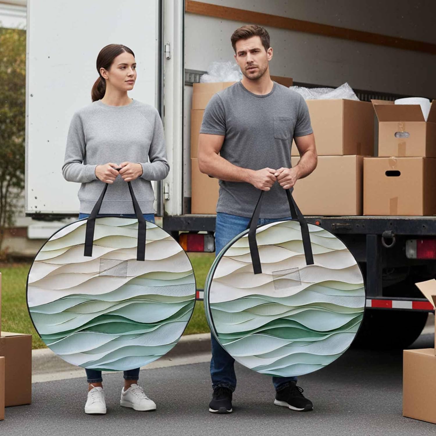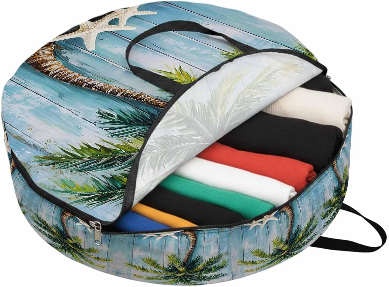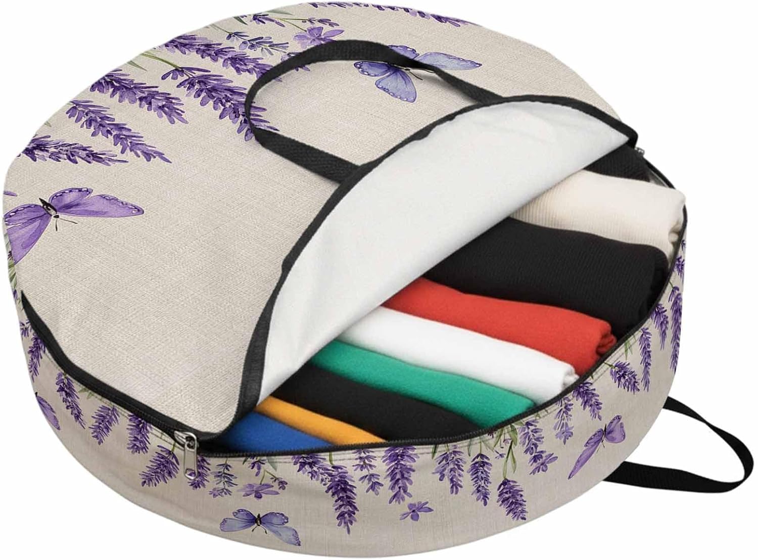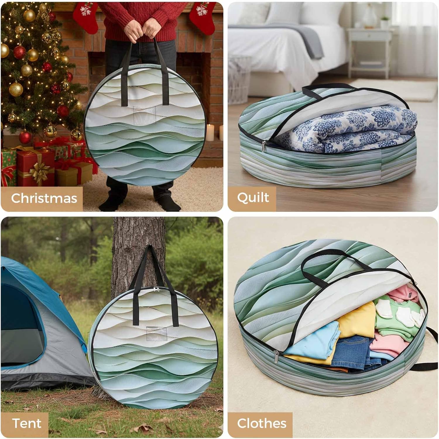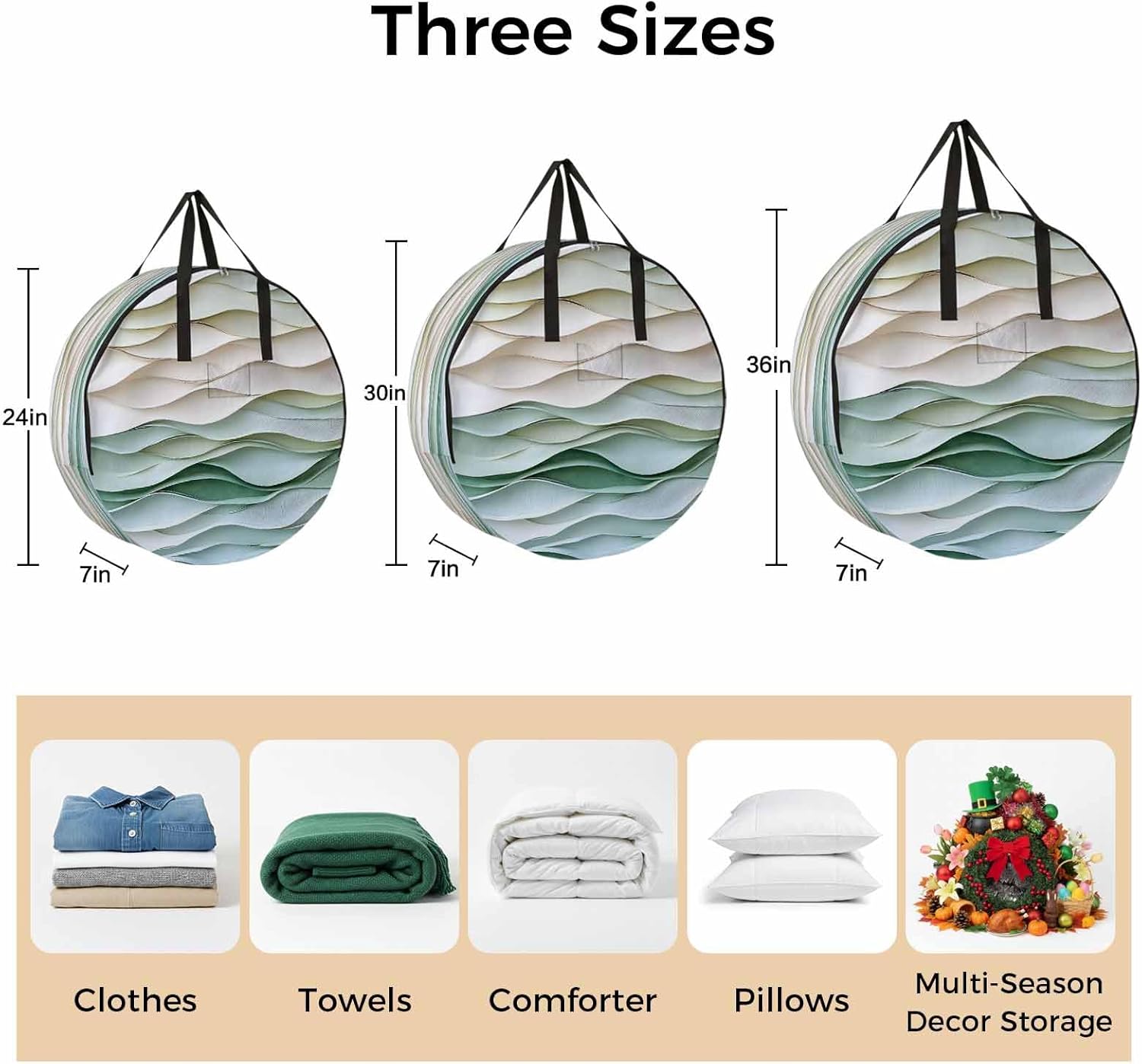 Reclaim Your Closet Space with the Round Storage Solution! Material: polyester Diameters: 24 inch, 30 inch, 36 inch Depth: 7 inches Package Includes: Round Storage Bag One Bag, Endless Possibilities: Whether you are swapping out your summer wardrobe, moving into a new dorm, or packing away holiday decorations, this bag has you covered. The circular design is uniquely suited for: Bedding: Comforters, quilts, sheet sets, and oversized pillows. Clothing: Winter coats, sweaters, and bulky ski gear. Home Decor: Holiday wreaths, garlands, and floral arrangements. Outdoor Gear: Camping blankets, sleeping bags, and beach towels. Dual Zippers: The high quality double zipper design allows the closet organizer to open wide from both sides, making it effortless to load and unload even the bulkiest comforters or wreaths. Reinforced Handles: Sturdy, reinforced handles are securely stitched to provide extra strength and a comfortable grip when carrying heavy loads or pulling the bag from under a bed. Clear Label Pocket: A transparent built-in label holder allows you to quickly identify the contents of each bag without ever having to unzip it, keeping your storage perfectly organized.