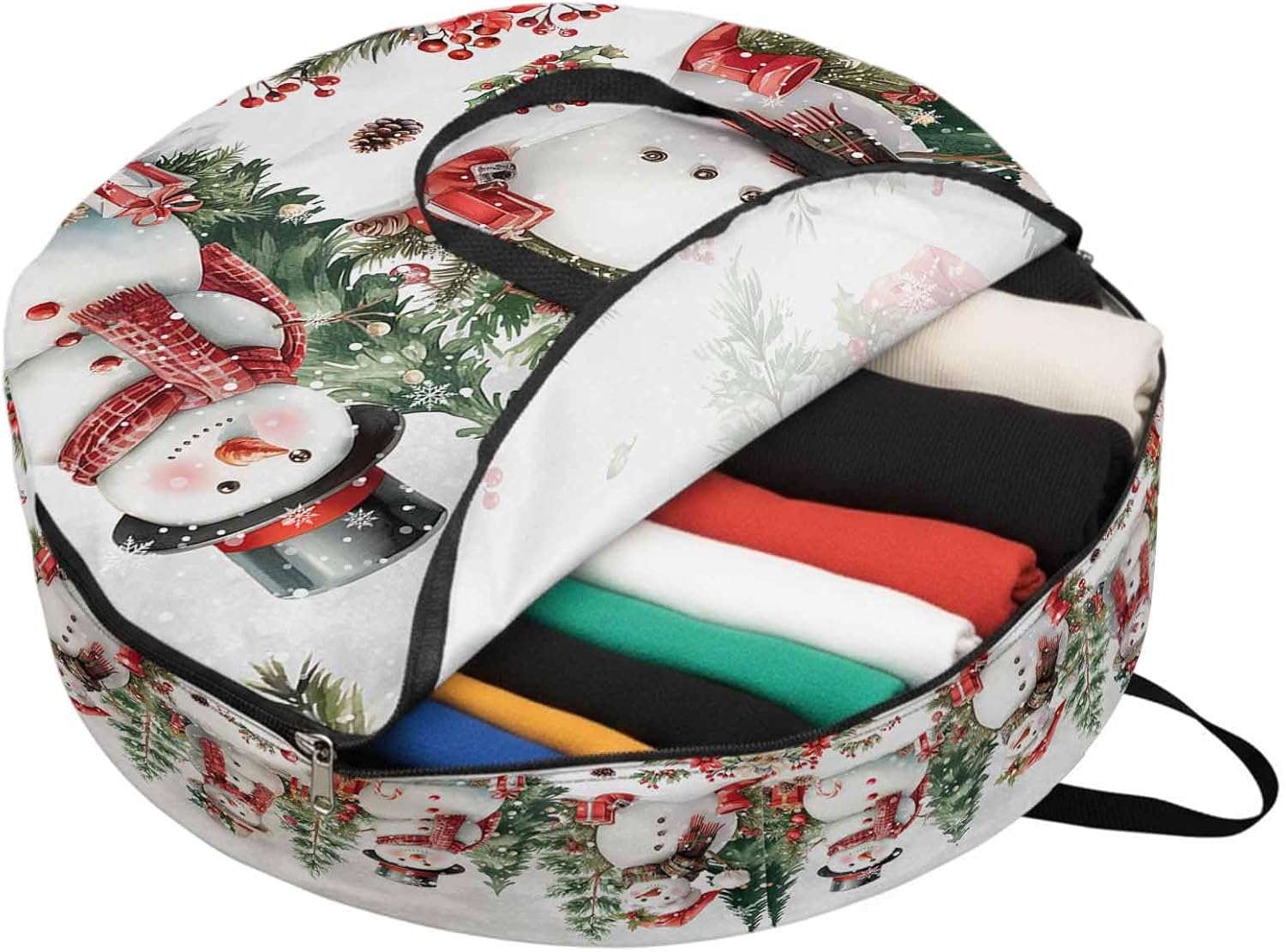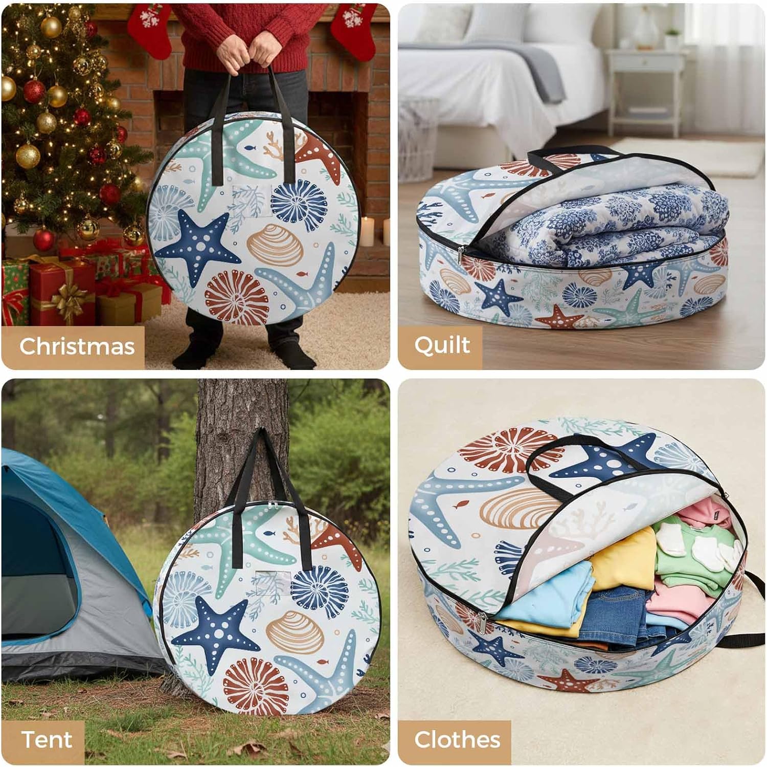 Reclaim Your Closet Space with the Round Storage Solution! Material: polyester Diameters: 24 inch, 30 inch, 36 inch Depth: 7 inches Package Includes: Round Storage Bag One Bag, Endless Possibilities: Whether you are swapping out your summer wardrobe, moving into a new dorm, or packing away holiday decorations, this bag has you covered. The circular design is uniquely suited for: Bedding: Comforters, quilts, sheet sets, and oversized pillows. Clothing: Winter coats, sweaters, and bulky ski gear. Home Decor: Holiday wreaths, garlands, and floral arrangements. Outdoor Gear: Camping blankets, sleeping bags, and beach towels. Dual Zippers: The high quality double zipper design allows the closet organizer to open wide from both sides, making it effortless to load and unload even the bulkiest comforters or wreaths. Reinforced Handles: Sturdy, reinforced handles are securely stitched to provide extra strength and a comfortable grip when carrying heavy loads or pulling the bag from under a bed. Clear Label Pocket: A transparent built-in label holder allows you to quickly identify the contents of each bag without ever having to unzip it, keeping your storage perfectly organized.