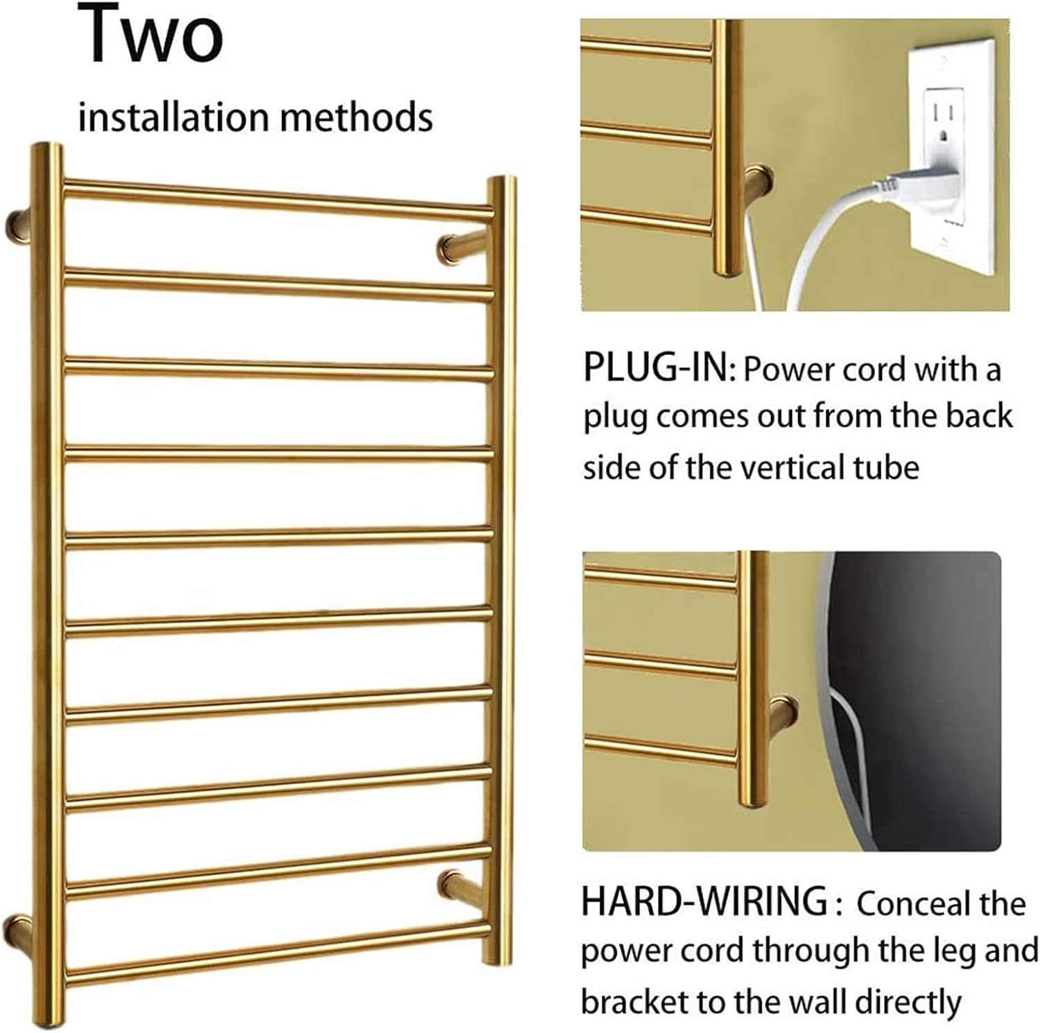 product description Name: Stainless steel heated towel rack Power: 88W Material: 304 stainless steel Surface treatment: electroplating Load-bearing: 10kg Number of floors: 10 Style: modern and simple Installation method: side outlet/into-wall concealed wire Product Highlights Drying, constant temperature, waterproof, safe, no damage to clothes, high-quality materials