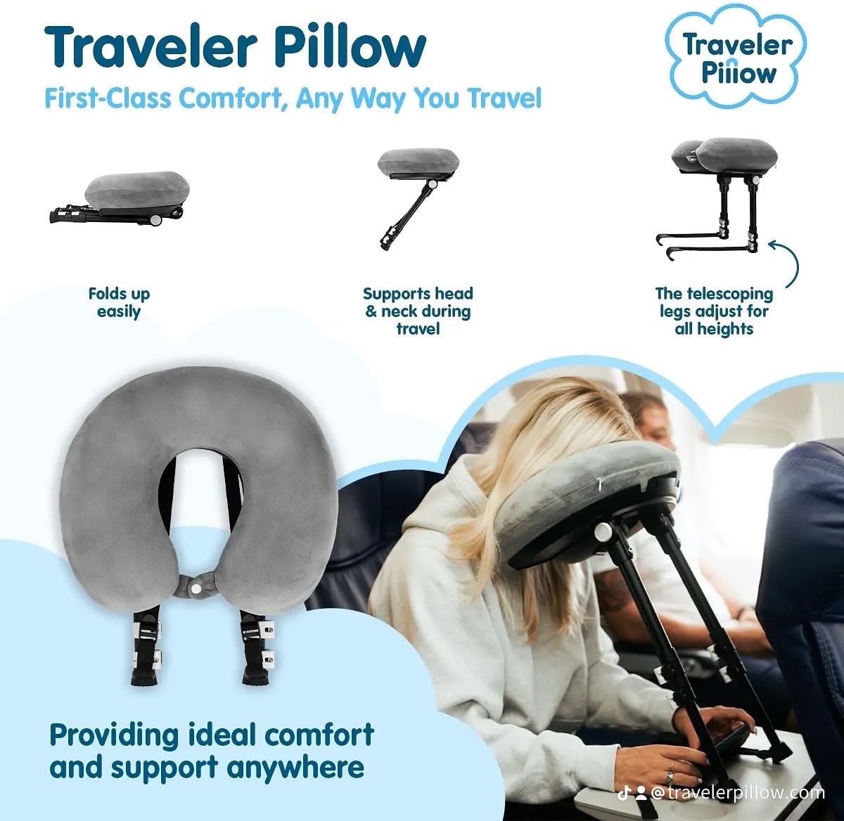 The Traveler Pillow is a revolutionary new way to rest comfortably in uncomfortable spaces. Say goodbye to neck strain, sleeplessness, and "head bobbing" with our innovative and fully adjustable design. The Traveler Pillow features a supportive memory foam face cradle and unique telescoping legs that provide a stable, customizable resting space wherever you are. Simply place the stand on a tray table, your lap, or the seat in front of you, and adjust the height and angle for the perfect fit. The Traveler Pillow also comes with a lightweight backpack that doubles as a blackout curtain, so you can create a private, dark space for a deeper, more restful sleep. Our removable, washable cover ensures a fresh and clean experience every time. Whether you're on a bus, on a train, in a car, or on a plane, the Traveler Pillow offers first-class comfort, helping you arrive at your destination feeling refreshed and ready for your next adventure. Try the amazing new Traveler Pillow today!