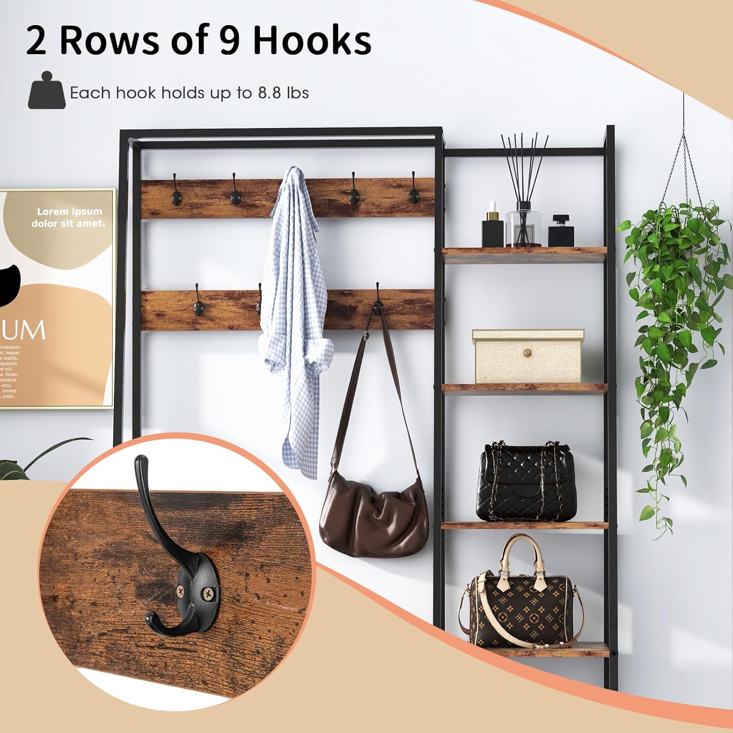 • 5-in-1 Design for Multi-layer Storage: The freestanding coat rack consists of 5 tier open storage shelves, 2 tier shoes storage shelves, a storage beach, and 2 rows of 9 hooks, providing a perfect storage solution to satisfy all your daily needs. You can store various items, like handbag, clothes, scarf, hat, shoes, storage box, etc.