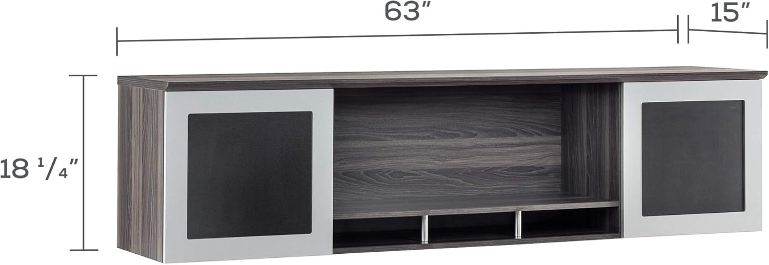 • STORE MORE STUFF. Measuring 63" wide, the Medina Hutch offers open shelving at the center and a silver-framed storage cabinet with a frosted glass door on each end to keep binders, books and other useful items organized and within easy reach.