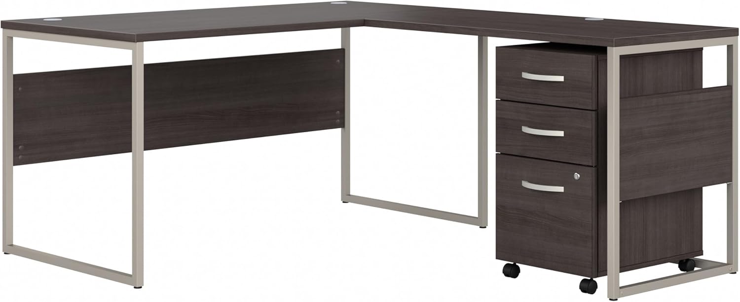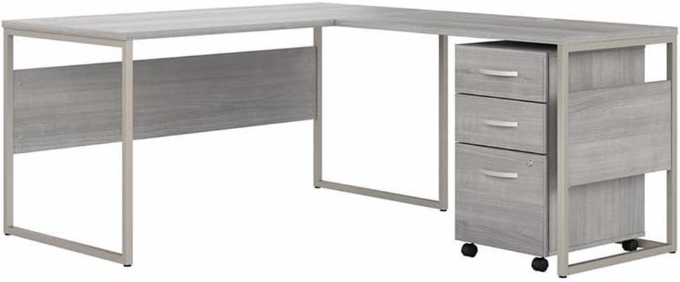 The Bush Business Furniture Hybrid 60W x 30D L Shaped Table Desk with 3 Drawer Mobile File Cabinet blends a durable work surface with sturdy metal legs to offer a stylish, long-lasting solution for the modern professional. Tackle your next project or assignment with a computer, books and more on a desktop that supports up to 200 pounds. Three built-in wire management grommets keep cords and cables in order, so your work area remains free from unnecessary clutter. The corner computer desk's open leg design and finished privacy panel allow it to look great facing any direction in a home or professional office. The filing cabinet's bottom drawer accepts letter, legal and A4-size paperwork while a pair of box drawers organize supplies. The two bottom drawers can be locked to protect sensitive files and personal items. Find the perfect look for your space with five finish options: Black Walnut, Modern Hickory, Platinum Gray, Storm Gray and White. This L Shaped Desk with Drawers has been meticulously tested to meet or exceed ANSI/BIFMA quality standards for safety, durability and performance and is backed by the Bush Business Furniture 10 Year Manufacturer's Warranty. See the full Hybrid Collection for coordinating items to enhance your workspace as needed, including Bookcases, Lateral File Cabinets and Storage Cabinets (coordinating items sold separately). American made with U.S. and imported parts.
