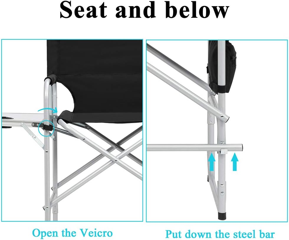 Introductions: The director chair is designed with 600D x 300D oxford fabric,it adopts high-strength material and delicat workmanship to ensure excellent quality and durability. With a foldable footrest,which can keep your feet comfortably secure on the chair. Besides, a built-in bottle holder, a large mesh bag as well as storage bags are also designed for giving you endless convenience. So Don't hesitate, it's worth buying! Features: 1. Folding chair, easy to store and carry 2. Good hardness and strength 3. With a foot rest to give you comfort 4. Designed with storage bags for convenience 5. Allow you to put small items inside the bag Specifications: 1. Material: 600*600D Double Oxford Cloth, PVC Coating On The Bottom, Plastic Sprayed Iron Round Pipe 2. Color: Silver Iron Pipe, Black Cloth 3. Dimensions: (40.55 x 23.62 x 19.29)" / (103 x 60 x 49)cm(L x W x H) 4. Loading: 264.55lbs / 120kg 5. Weight: 14.55lbs / 6.6kg Package Includes: 1 x Chair 1 x Side Table 1 x Side Table Plastic Cup Holder 1 x Side Pockets 2 x Pu Armrest Sleeve 2 x Oxford Armrest Cover