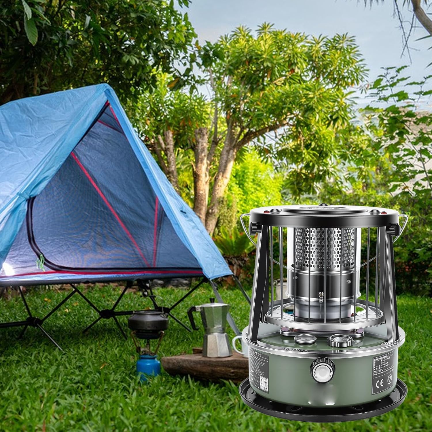 1. Kerosene Heater Indoor: Portable kerosene heater provides quick heat to efficiently warm large space, suitable for garage, living room, bedroom, apartment, and RV. 2. No Electricity Needed: This kerosene heater with 5.2L tank that provides 20 to 25 hours of heat. Includes a complete accessory set with funnel, siphon pump, gloves, and extra wicks. 3. Reliable Heater: Stay warm during power outages, snow storms, or winter emergencies with this small kerosene heater. It ensures you remain comfortable and prepared for unexpected weather conditions. 4. Safe and Energy Saving: Save on utility bills with this kerosene heater. Designed with adjustable height design allows you to control heat output more effectively, protective safety net for added safety, ensuring reliable warmth. 5. Multipurpose Use: Suitable for indoor and outdoor spaces, this compact kerosene heater is ideal for camping, tent, porch, greenhouse, and patio. It doubles as a reliable backup heat source, with a flat top that allows you to boil water or cook food while keeping warm. Specification: Item Type: Kerosene Heater Material: Cold Rolled Sheet, Stainless Iron Weight: Approx. 4700.00g / 165.79oz Heating Efficiency: 2.6KW Kerosene Heater Lower Size: Approx. 33x33x34cm / 13x13x13.4in Kerosene Heater Higher Size: Approx. 33x33x46cm / 13x13x18.1in Fuel Tank Capacity: 5.2L Continuous Heating: 20-25 Hours Ignition Method: Manual Ignition How to Use: Ignition: After filling with kerosene, let it sit for 30 minutes, lift with left hand, pull up on the handle of the combustion chamber spring, and ignite the wick. Extinguishing: Turn the knob counterclockwise and rotate the center knob to the left (OFF) to confirm that the wick has dropped to the bottom PackageList: 1 x Kerosene Heater 1 x Funnel 1 Pack x Wick 1 x Storage Bag 1 Pair x Gloves 1 x Pipe 1 x Instruction Manual