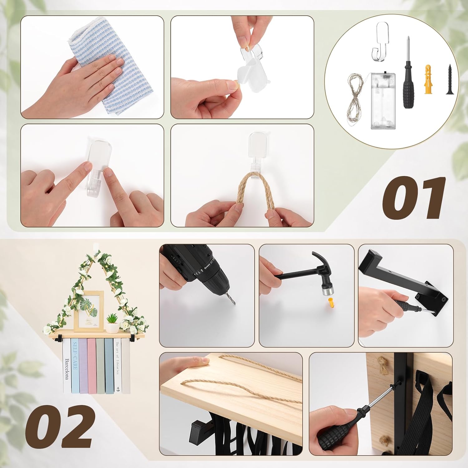 Features: Versatile Aesthetics: Boasting an art deco style, this shelf harmonizes with Bohemian, modern, or minimalist aesthetics, seamlessly integrating with any home decor. It's a ideal fit for bedrooms, living rooms, offices, bathrooms, or kitchens, enhancing any area with its versatile design and sophisticated appeal. Thoughtfully Designed Gift: Offering more than simple storage, this two-piece shelving set makes for a meaningful gift. Ideal for those passionate about home decor or plant displays, its striking design and multifunctionality ensure it stands out as a vibrant feature in any household, enriching living spaces with style and inspiration. Specifications: Main Material: wood Size: Floating wall shelf: 16 x 6.7 inch String lights: 6.6ft Flower garland: 7ft Package includes: 2 x Floating wall shelf 2 x String lights 2 x Flower garland Notes: Manual measurement, please allow slight errors on size. The color may exist a slight difference due to different screen displays.