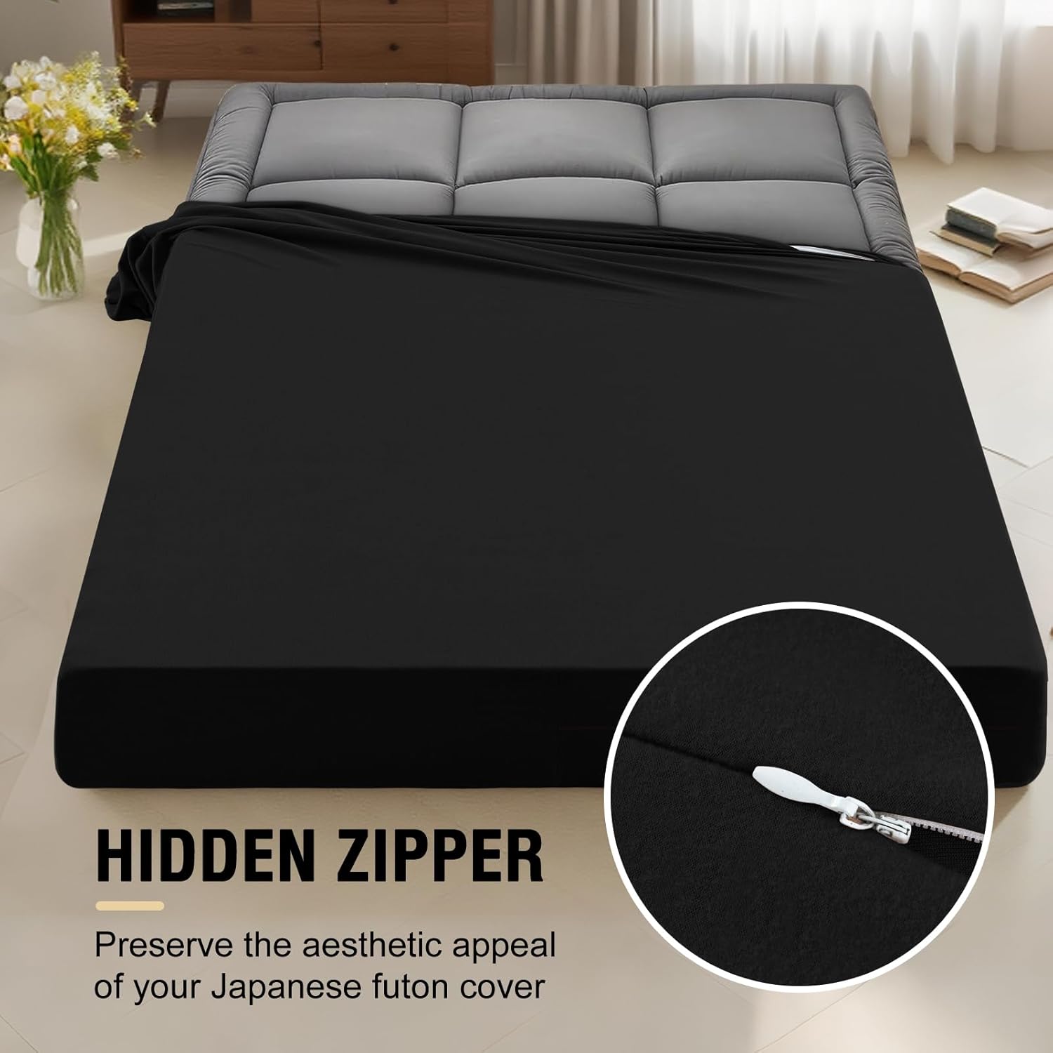 PrinceDeco Extra Thick Futon Mattress Cover for Traditional Japanese Futon Mattress, Floor Mattress Cover with Zipper, Machine Washable, Black, Full