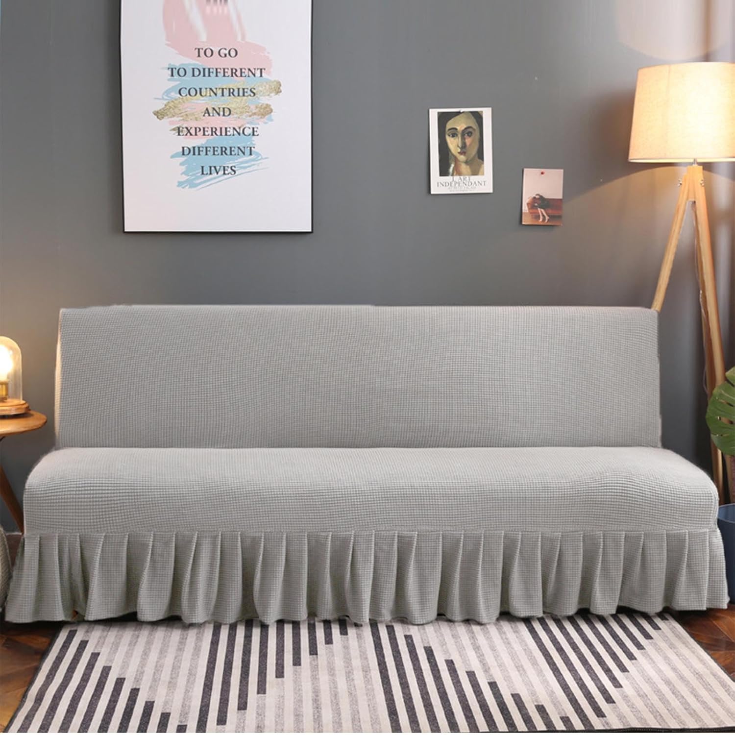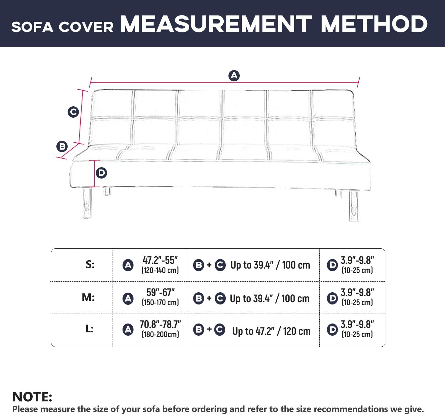 Specification:- Material -Jacquard knitted fabric, skin-friendly, breathable, wrinkle-resistant, and non-fading-The elastic futon slipcover is designed with elastic bands and is elastic, which can fit your sofa very firmly and stay in place. - This fitted full-size sofa cover is a must-have for your home and is suitable for most sizes of sofas.- Our sofa slipcovers can fully cover your sofa, including the sides. The stretchy sofa bed cover is especially suitable for families with pets and children. It can be protected from daily stains and prevent pets from biting or scratching our sofas. -Machine washable - separately in cold water on a gentle cycle.Size:S: Sofa length 120-140 cm/47.2-55 inch, Sofa width: Up to 100cm/39.4 inch , Sofa cushion thickness: 10-25 cm/3.9-9.8 inch;M: Sofa length 150-170 cm/59-67 inch, Sofa width: Up to 100cm/39.4 inch , Sofa cushion thickness: 10-25 cm/3.9-9.8 inch;L: Sofa length 180-200 cm/70.8-78.7 inch, Sofa width: Up to 120cm/47.2 inch , Sofa cushion thickness: 10-25 cm/3.9-9.8 inch;Package:-1x futon coverNOTE - Our super stretchy futon sofa slipcovers can be used for folding futon sofas, sofa beds and armless sofas. Please measure the size of your sofa before ordering and refer to the size recommendations we give.