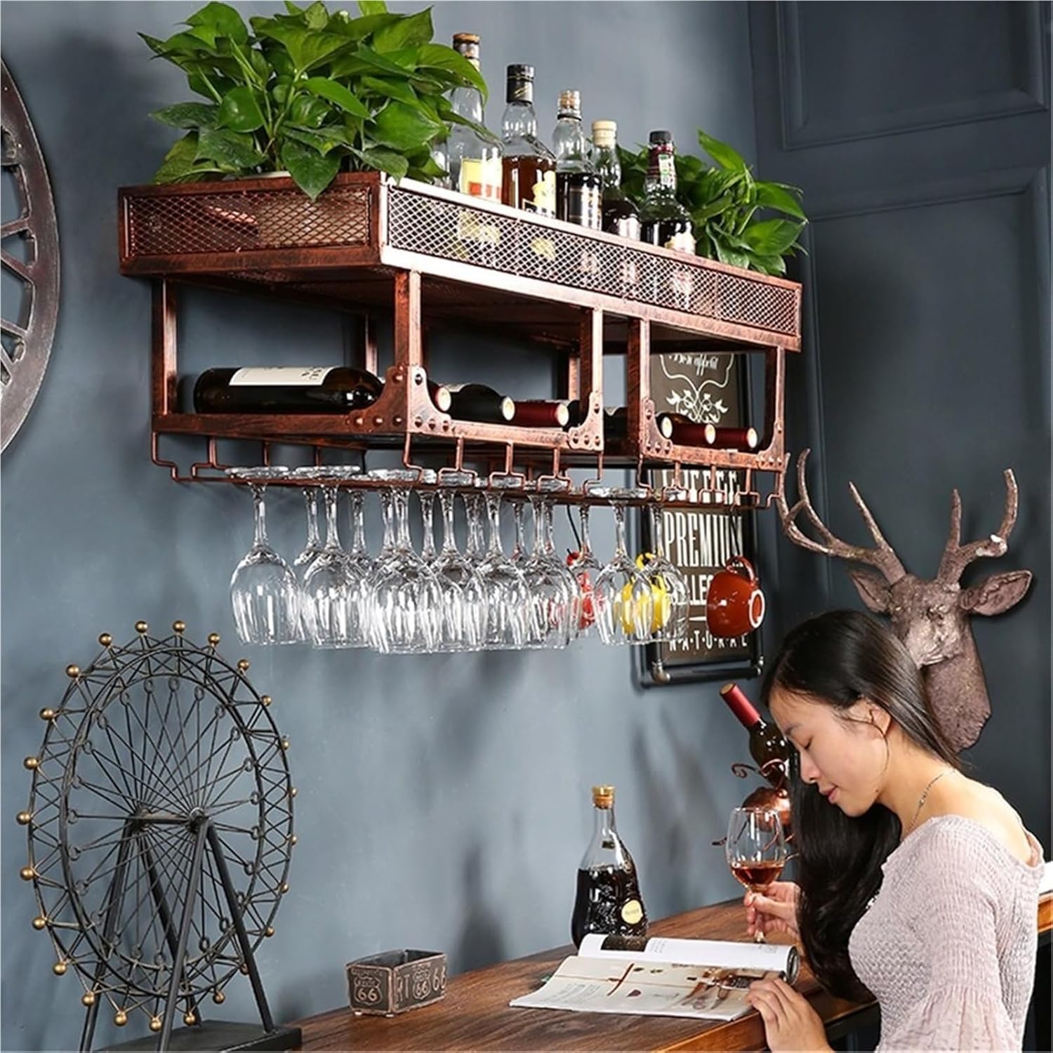 Wine Shelf Vintage Metal Wine Rack with Double Layer Grid | Bottle & Glass Holder - Rustic Wall Decoration for Kitchen/Bar/Restaurant Wine Holder