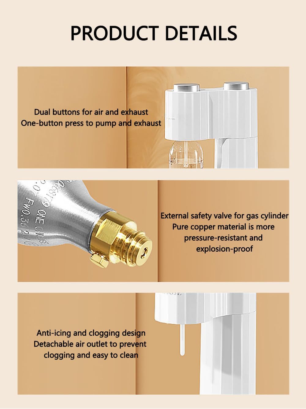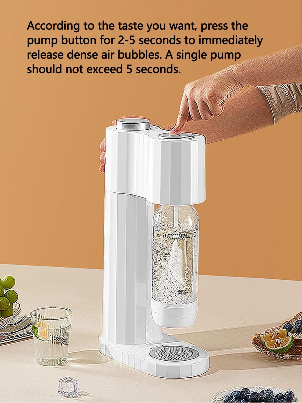 How to Use the Pupdumm Soda Maker 1. Fill – Use Cold, Clean Water Fill the BPA-free PET bottle with cold drinking water between the max/min lines.Using colder water (below 40°F / 4°C) gives stronger bubbles and better carbonation. 2. Press – Quick Manual Carbonation Firmly press the carbonation button downward until you hear a hissing sound, which means CO₂ is entering the bottle. Recommended carbonation: Press 2–3 times, for 2–3 seconds each, depending on how fizzy you like your drink.You can create light, medium, or strong fizz anytime. 3. Enjoy – Fresh Sparkling Water in Seconds Remove the bottle, seal it with the cap, and enjoy homemade sparkling water—anytime, anywhere.You may add fruits or flavor drops after carbonation for a refreshing