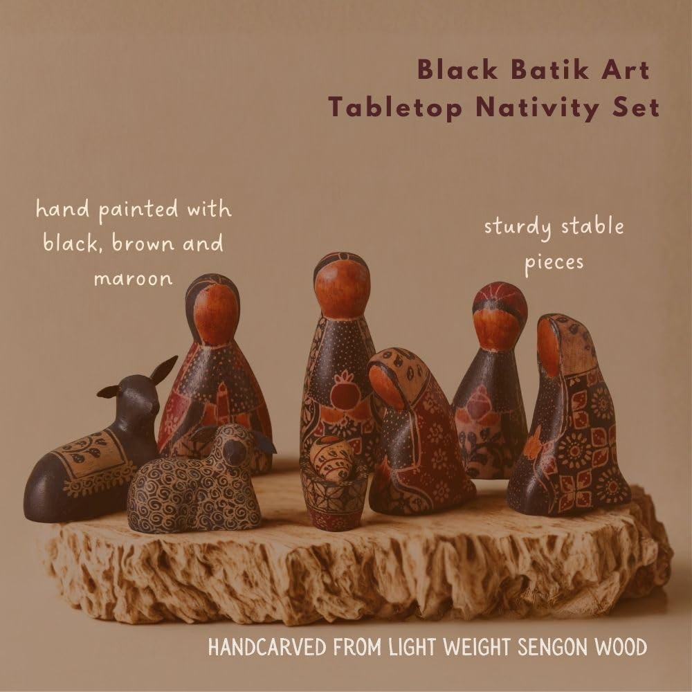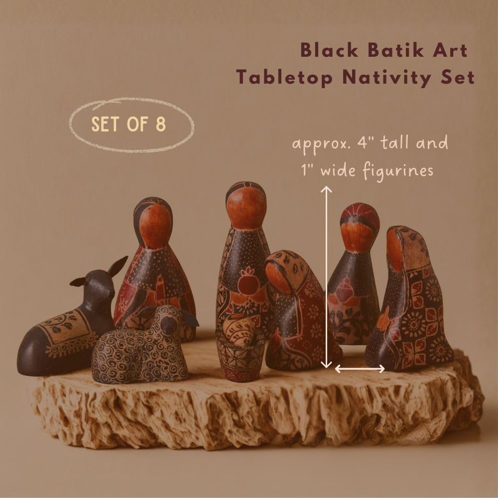 This exquisite Black Batik Art Tabletop Nativity Set brings a unique cultural twist to your traditional Christmas display. Handcrafted from lightweight Sengon wood, this 8-piece collection features beautifully detailed figurines that stand approximately 4 inches tall and 1 inch wide, making them perfect for mantels, shelves, desks, or any tabletop surface. Each piece is meticulously hand-painted with intricate batik-inspired patterns in rich black, brown, and maroon tones, creating a stunning visual display that celebrates both the nativity story and artistic craftsmanship. The set includes all essential nativity characters plus animals, with each figurine designed as a sturdy, stable piece that stands securely on its own. These collectible wooden statues can be arranged to create your own festive Christmas manger scene, and they pair beautifully with string lights, ribbons, and pine cones for enhanced holiday ambiance. Whether you're a nativity collector or seeking distinctive Christmas decorations that stand apart from conventional designs, this handcrafted set adds warmth and cultural richness to your seasonal home decor.