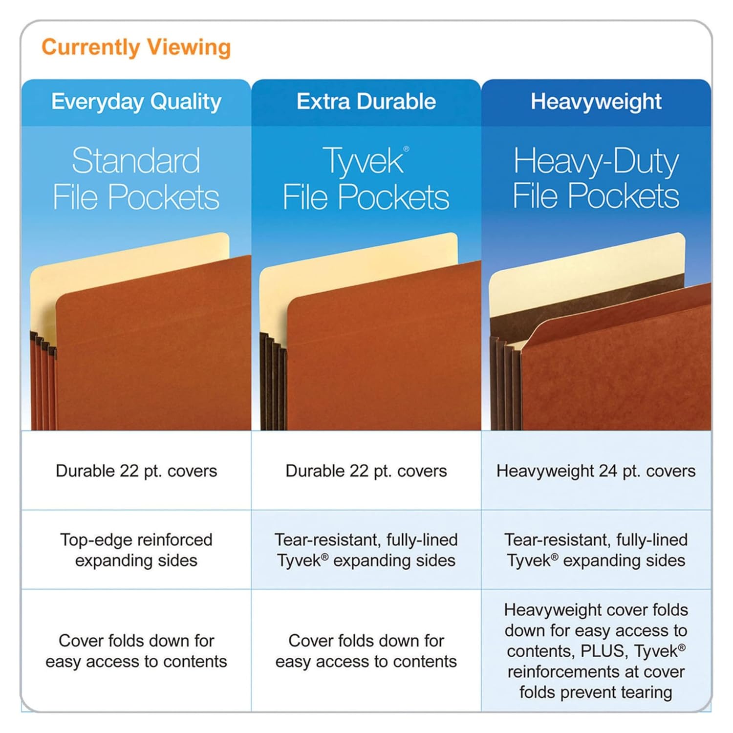 These durable Pendaflex File Pockets expand 5.25" inches to hold up to 1,050 sheets each. Protective 6-1/2" high expanding sides are reinforced along the top edge with DuPont™ Tyvek material for added durability. Straight-cut redrope pockets have double-thick manila lined panels. The front panel is scored to fold down for easy, open-top access to your bulky projects. Pendaflex file pockets bring quick organization to untidy papers and work well for the desktop, file drawer, or long-term storage. Letter Size. 5-1/4" Expansion. Redrope. Box of 10. Fit More Per Pocket: If your massive files put a strain on ordinary folders, consider an upgrade. These redrope pockets expand 5-1/4" so big projects have room to grow. Keep Papers Protected: 6-1/2" High expanding sides keep papers of all sizes contained. Sides reinforced with Tyvek material along the top edge provide added durability. Double-Ply Durability: Tough redrope panels lined with heavy manila stock resist rips and tears. Reduce, Reuse, Recycle: These Pendaflex file pockets have paper made from 30% recycled fiber with 30% post consumer fiber. Tyvek is a trademark of DuPont used under license by LSC Communications US, LLC d/b/a TOPS Products.