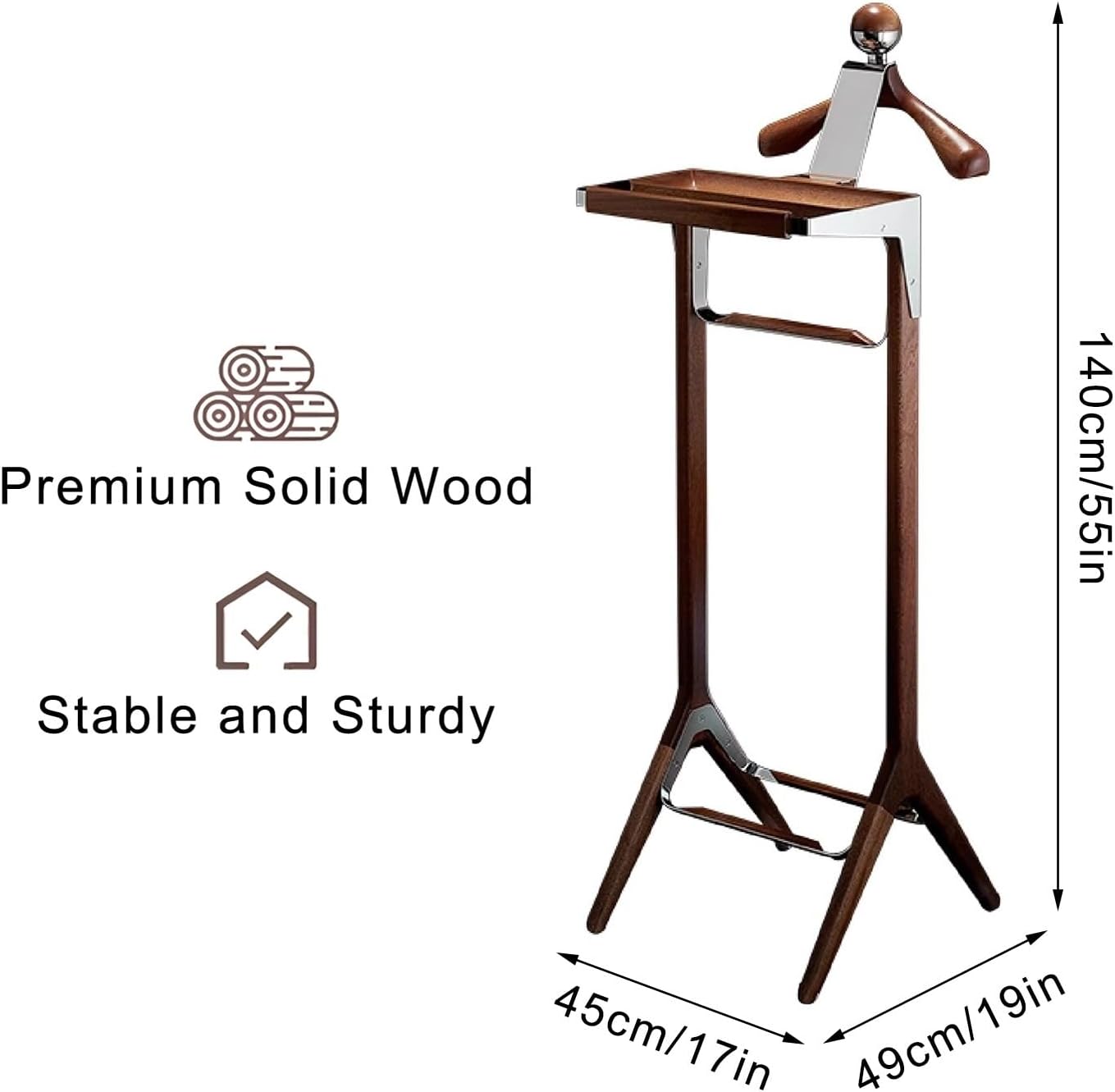 Are you still struggling with the clutter of clothing organization?Upgrade your wardrobe organization with our suit valet stand, the valet stand designed specifically for hanging clothes. This elegant suit valet stand not only provides a stylish and functional solution for hanging suits, trousers, and shirts but also adds a touch of sophistication to your bedroom or dressing area.It is not only a suit rack but also a bright landscape in your home space, providing an elegant and practical habitat for your clothes, hats, scarves, and bags, and making your home more neat and orderly.Keeps your wardrobe off the floor, bed, or chair, making your suit look sharp and of wrinkles.ApplicationIt is used in bedrooms, living rooms, hallways, foyers, offices, and small apartments to hang items such as hats, scarves, bags, and clothes.SpecificationName: Suit Valet StandMaterial: Solid WoodAssembly Required: YesPackage1 x Suit Rack1 x InstructionNotesPlease note that items such as suits and trousers are not included in this product.Please allow the slight color difference caused by the shooting light and 1-3 cm error due to manual measurement, and make sure you do not mind before ordering.