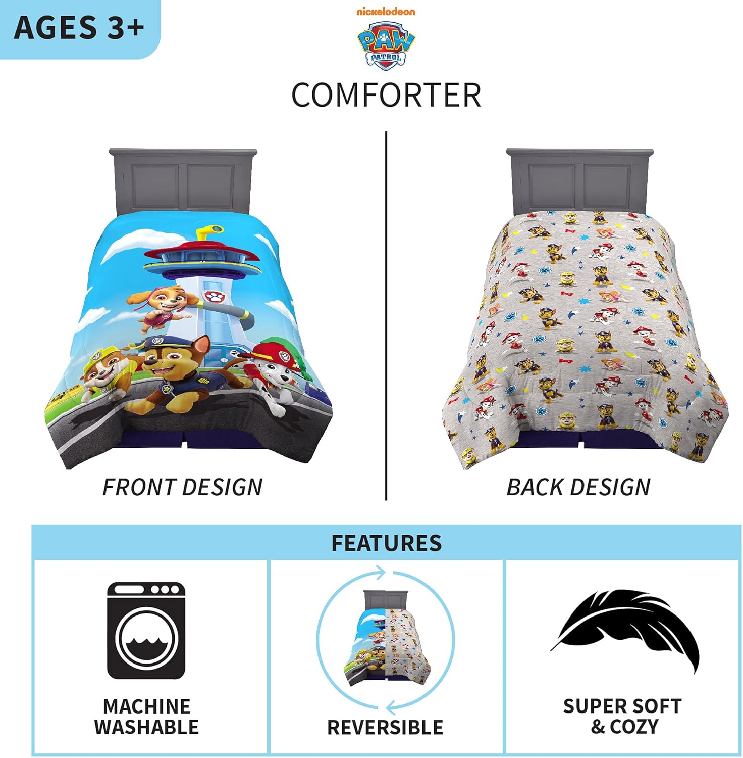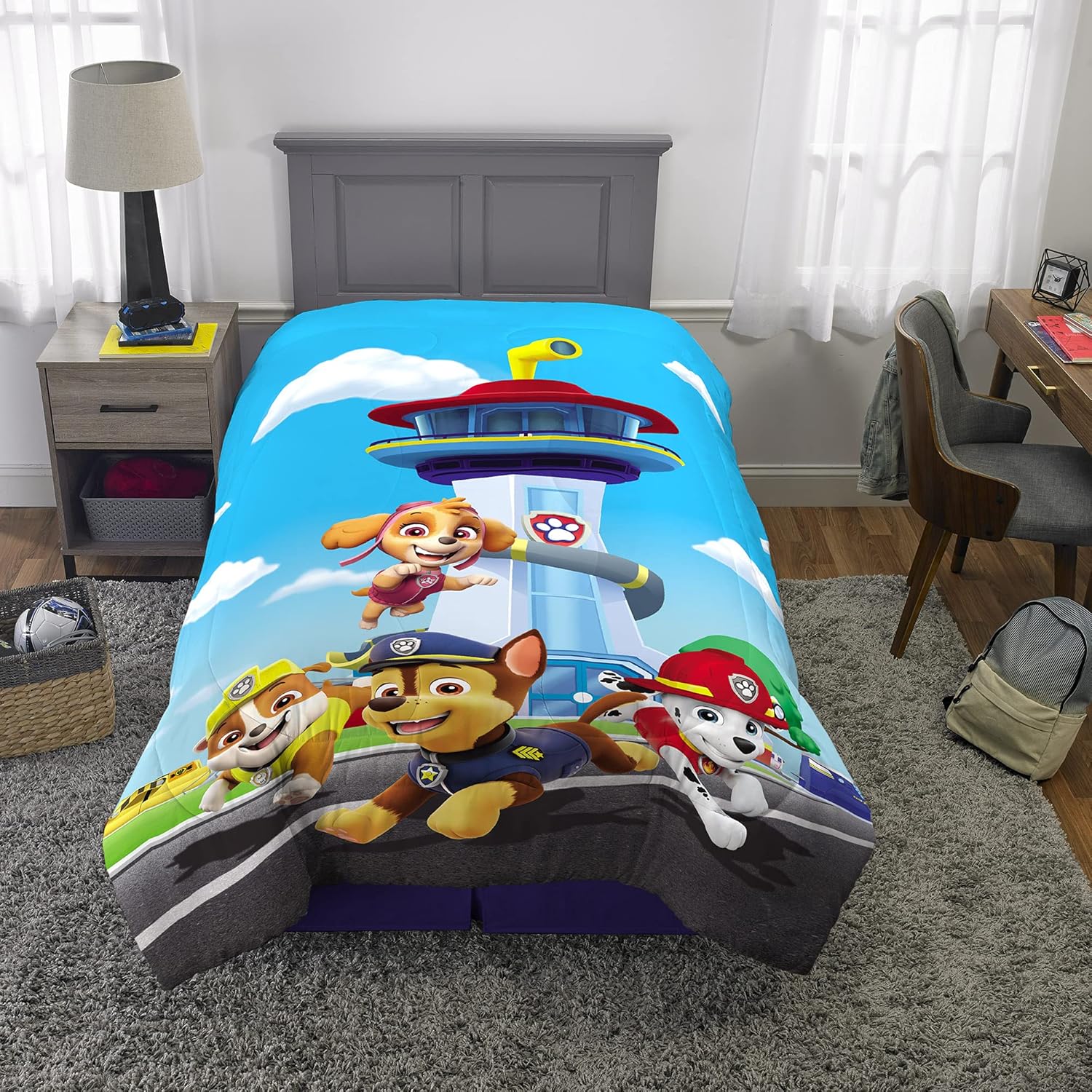 Tuck them in alongside their favorite pups from Nickelodeon’s Paw Patrol with this cute and colorful comforter. Chase, Marshall, Rubble and Skye are on a roll, ready to keep kids comfy while they dream of heroic adventures with their puppy pals. This Paw Patrol comforter fits both twin and full size beds and is made from high quality microfiber material for softness and durability. Kids will feel safe and sound wrapped up with their favorite Paw Patrol pups at bedtime and naptime. With its unique reversible design, this multicolor comforter can simply be flipped over when kids are ready for a new look. One side features an action-packed multicolored image of Marshall, Chase, Skye and Rubble against a bright blue background and all-over character art pops against a light grey backdrop on the other side. Kids love to watch the adorable antics of the brave and friendly pups of Nickelodeon’s Paw Patrol. Bring the excitement of the animated series home with high-quality bedding that helps keep them cozy while they await their next rescue mission.