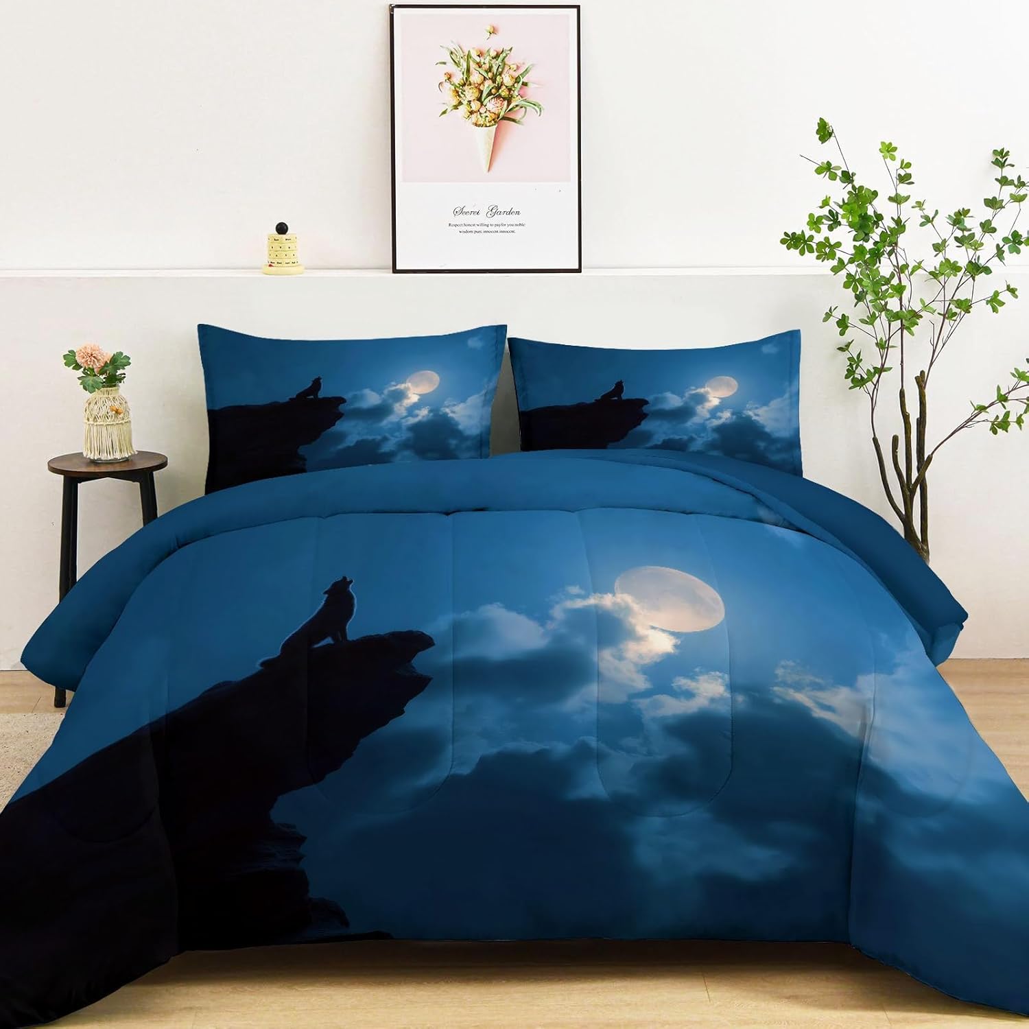 Bedding Set Queen Lightweight Soft 3 Piece Mountain Animal Wolf Moon Comforter Set with 2 Pillow Covers, Quilt Breathable Blue Sky White Clouds Comforter (90" x 90") for Girls Boys Kids