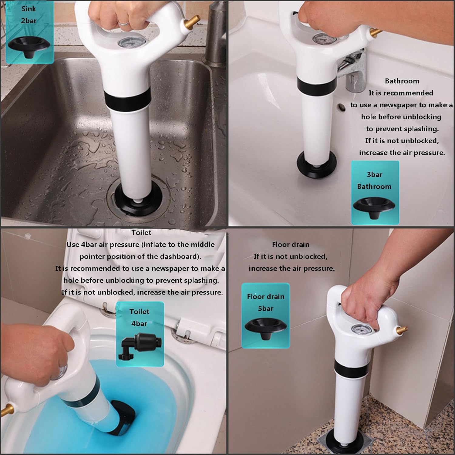 Toilet Plunger,Drain Clog Remover Tools,High Pressure Air Toilet Plungers Heavy Duty Plunger Effortless Unclogging: Say goodbye to sewage splatter issues with our upgraded electric plunger blaster. We've improved the toilet-specific head with flexible bending, ensuring easier use compared to . Apply gentle downward pressure to effortlessly unclog, avoiding any embarrassing situations caused by sewage splatter.Safety and Reliability: Our design prioritizes safety and reliability with multiple enhancements. It features an anti-misoperation start switch and a pressure overload relief valve, preventing potential hazards from improper operation. Lightweight and portable, it's easy to carry, store, and requires no specialized skills, ensuring hassle-free use.Versatile Usage: This air - powered plunge blaster isn't limited to toilets; it's perfect for unclogging sinks, bathtubs, kitchen drains, and pipelines. A multi-purpose tool addressing various drainage issues in your home, it provides efficient solutions wherever you need it.Features:Size: 15.7in/40cm*3.9in/10cmMaterial: ABS, rubber, TPEPackage:1 x toilet suction head1 x sink vacuum head1 x air pump