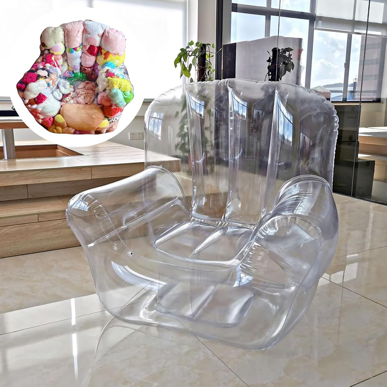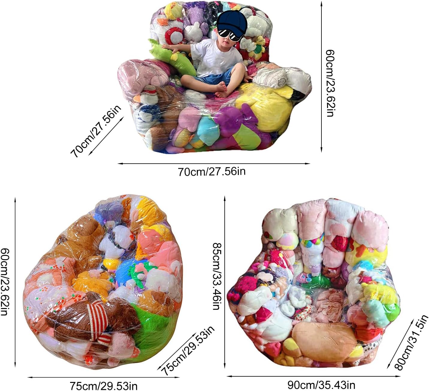 Description: Item Name: Toy Storage Sofa Material: PVC Features: Waterproof, Transparent Design, Extra Large Size Details: A, L: 75cm/29.53", W: 75cm/29.53", H: 60cm/23.62" (Approx.) B, L: 90cm/35.43", W: 80cm/31.5", H: 85cm/33.46" (Approx.) C, L: 70cm/27.56", W: 70cm/27.56", H: 60cm/23.62" (Approx.)Notes: Due to the light and screen setting difference, the item's color may be slightly different from the pictures. Please allow slight dimension difference due to different manual measurement.Package Includes: 1 x Toy Storage Sofa