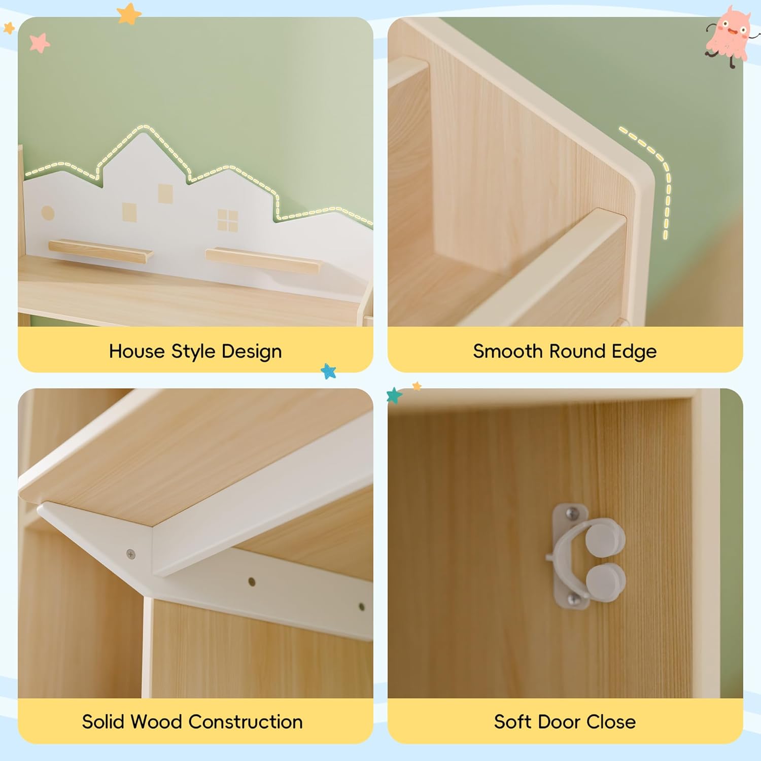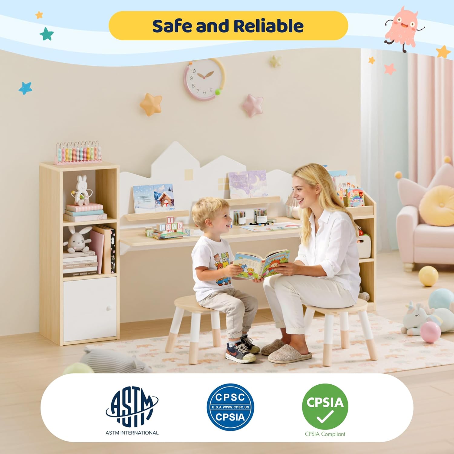 • Premium Quality and Safety Standards: Crafted from high-quality wood, this kid's study desk with bookshelf meets rigorous safety standards, including ASTM, CPSC, and CPSIA certifications. The solid wood construction ensures durability, while the desk’s smooth round edges and soft door closures add an extra layer of safety, reducing the risk of injury.