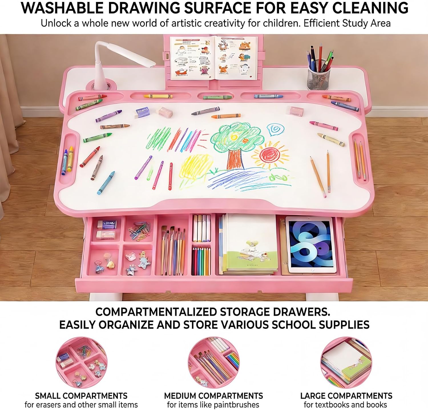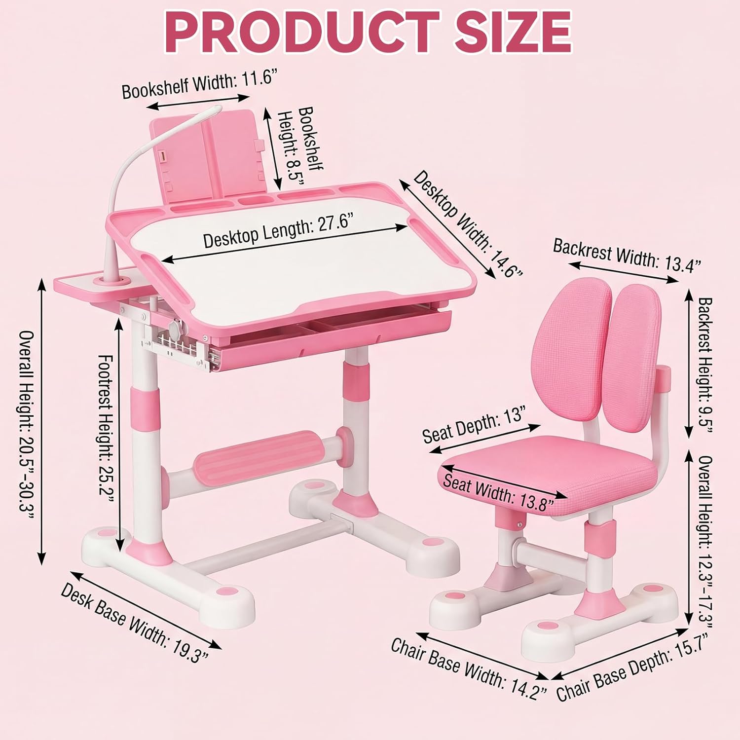 oranqran Kids Study Desk and Chair Set, Height Adjustable Art Desk for Bedroom, Study Table with Tilt Desktop, Book Stand, LED Light, Metal Hook and Storage Drawer for Boys Girls(Pink)