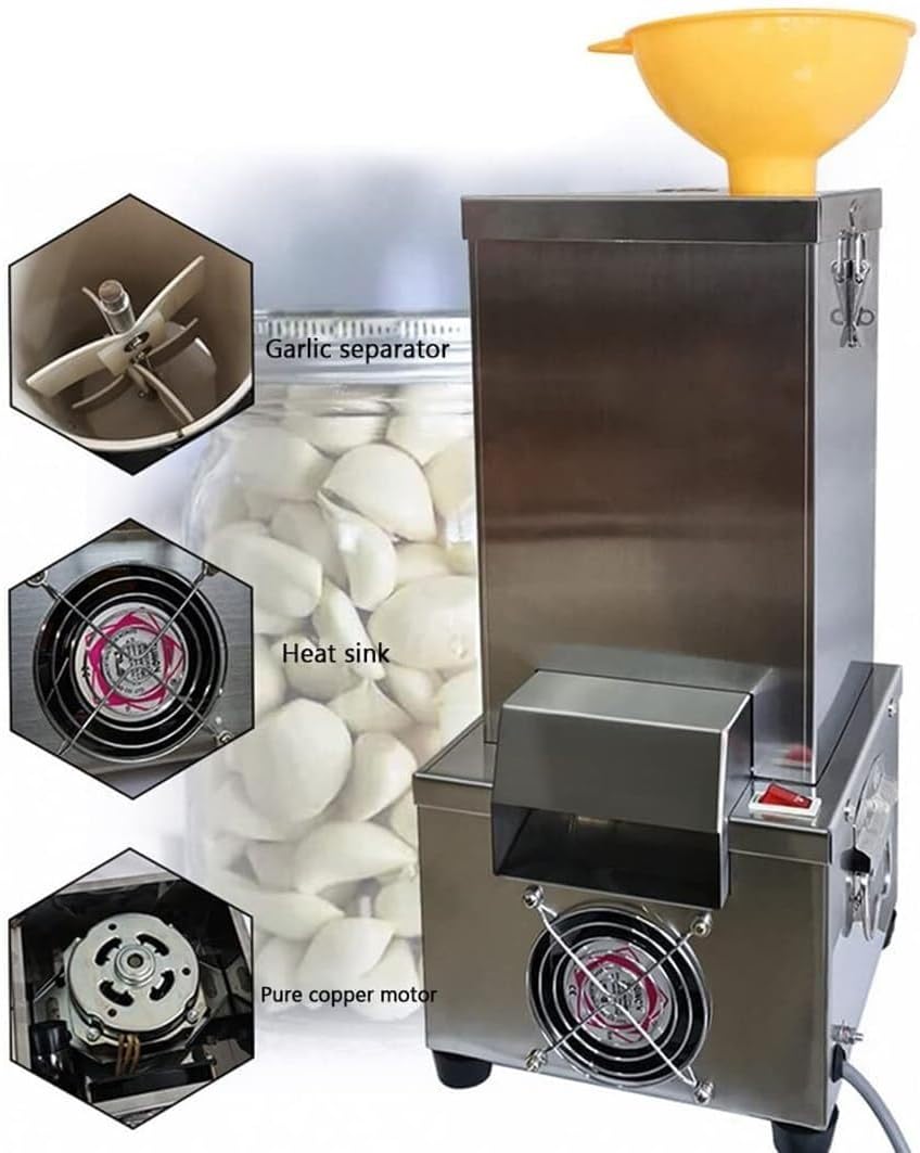 Commercial Garlic Peeling Machine Electric Garlic Separator 25KG/H Whole Garlic Peeler for Restaurant Kitchen ToolSpecification:Name: Garlic Peeling MachineMaterial: Stainless steelMotor power: 200WRated voltage: 110V-240VOutput per hour: 25kg/hourPeeling rate: 98%Net weight: 8.5kgGross weight: 10kgPackage size: 25*25*48cmAbout peeling:The garlic machine can only remove dried garlic, if it is chopped into granules and dried in the sun, the effect will be betterThe peeling rate of red garlic/purple garlic is lowWet fresh garlic cannot be peeledRegarding damage:The garlic will be a little damaged (do not buy if you can't accept the customer's request), but it will not affect the use of the garlicNot suitable for buying and selling in the market (suitable for personal use in hotels, barbecue shops, western restaurants, etc.)The main function of the machine is high efficiency, which solves the problems of slow manual peeling and hand pain.Packing list: 1 * Garlic Peeler1 * English manualKind tips:Before starting the machine, please carefully check whether there is debris in the peeling barrelMake sure the machine cover is lockedPut the garlic to be peeled into the funnel, preferably dry garlic, so that the peeling rate will be higherBefore cleaning and disassembly, please disconnect the power and stop the machineDuring processing, please do not press the switch with wet handsIf you have any questions, please feel free to contact. Your questions will be answered within 24 hours.