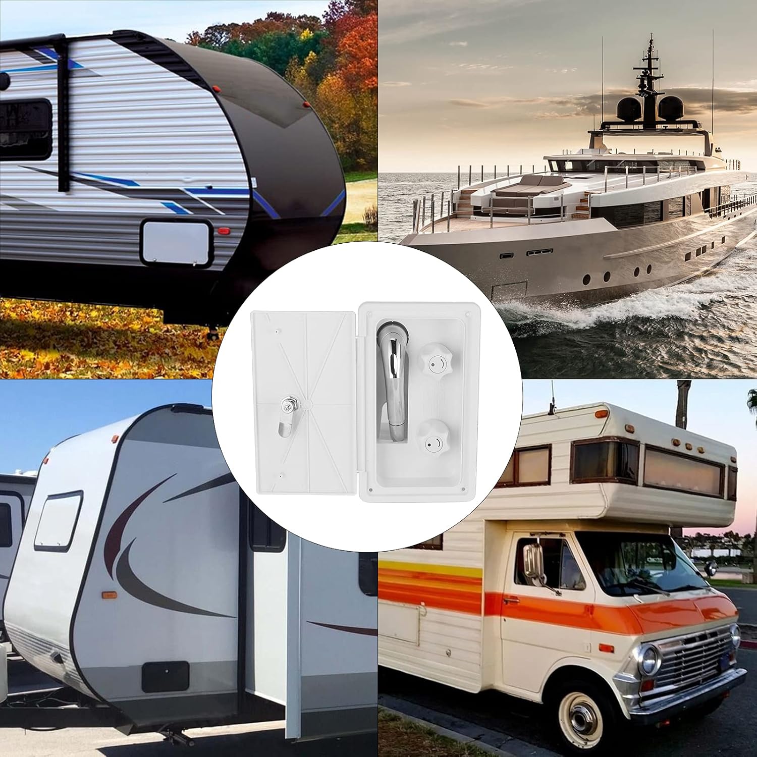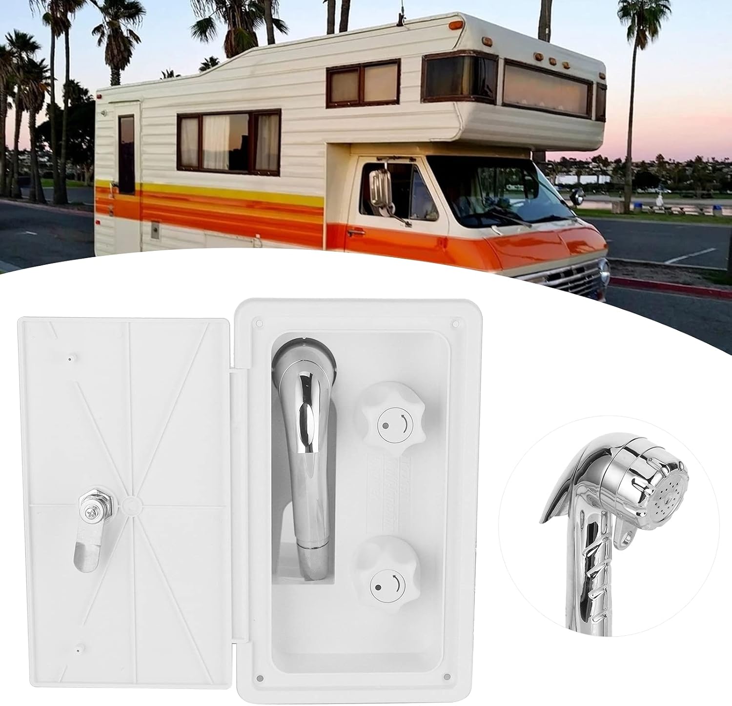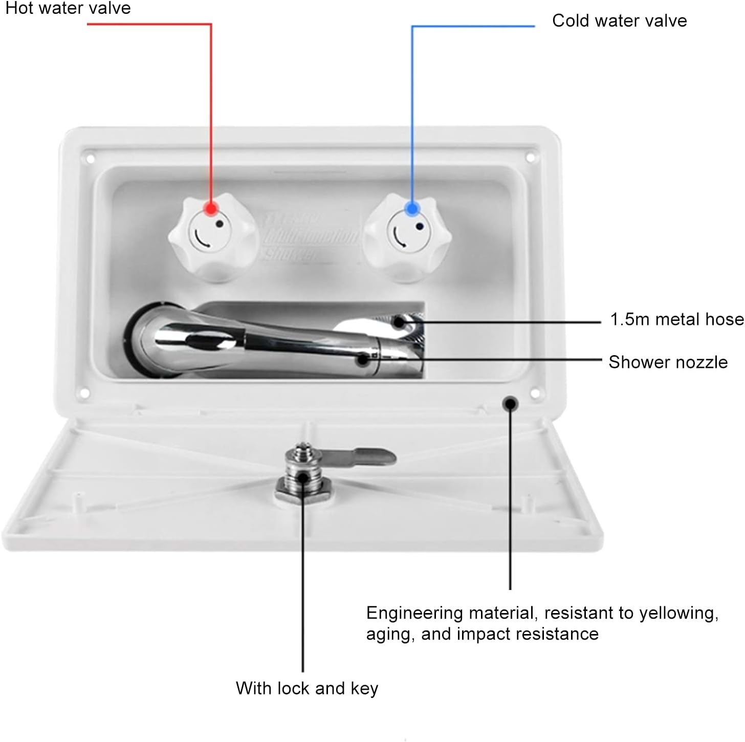 Specification: Item Type: RV Exterior Shower Box Kit Material: ABS+Stainless Steel Color: White Hole Size: Approx. 231x118mm/9.1x4.6in Key: 2pcs Shower Head: 1pc Shower Pipe: Approx. 1.5m/4.9ft (Stainless steel metal material) Outlet: Hot/cold water Water Inlet Diameter: Approx. 21mm/0.8in Installation Instructions: Install the shower box on the side of the RV and fix it How to Use: After the shower box is installed, press the shower head to start the shower. Package List: 1 x RV External Shower 1 x Shower Head (Metal Hose) 2 x Keys 5 x Fixing Screw 1 x Rubber Plug