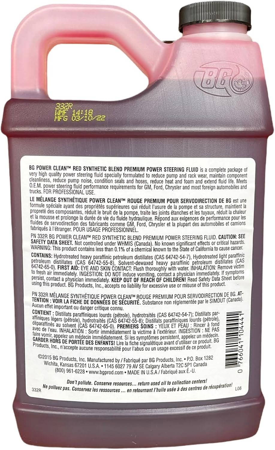 BG K6700R Power Steering Flush Kit Synthetic Blend Fluid PN 332R & Quick Clean PN 108BG Quick Clean for Power Steering safely and effectively eliminates accumulated deposits from power steering pumps, lines, racks, and valves.Power steering systems experience extremely high fluid pressures and temperatures. These conditions cause power steering fluid to break down rapidly, losing lubrication capabilities over time. Even under normal operation, the power steering system produces abrasive wear metals that cause seal and valve damage. This wear can eventually lead to expensive component failure.BG Quick Clean for Power Steering cleans contaminants from the power steering system quickly and safely. Installed by a professional, it removes deposits from power steering pumps, lines, racks, and valves. BG Power Clean Red Synthetic Blend Premium Power Steering Fluid is a complete package of very high quality power steering fluid formulated to reduce pump and rack wear, maintain component cleanliness, reduce pump noise, condition seals and hoses, reduce heat and foam, and extend fluid life. Meets O.E.M. power steering fluid performance requirements for GM, Ford, Chrysler, and most foreign automobiles and trucks.Includes a Smilyeez pocket screwdriver.